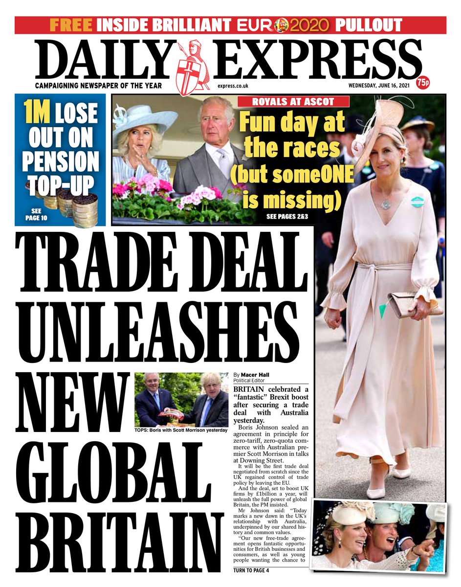 “A fantastic Brexit boost” is the lead in the Daily Express – it’s assessment of the UK’s new trade deal with Australia.