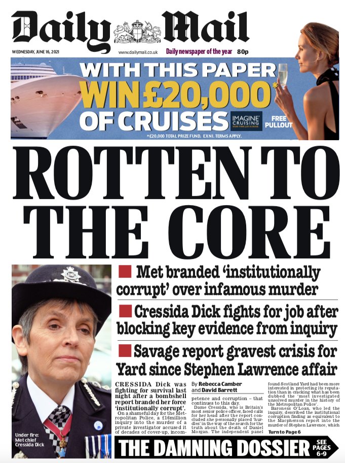 Pressure on the head of the Metropolitan Police is the lead in the Daily Mail – following a report into the force’s handling of the 1987 murder of private investigator Daniel Morgan.