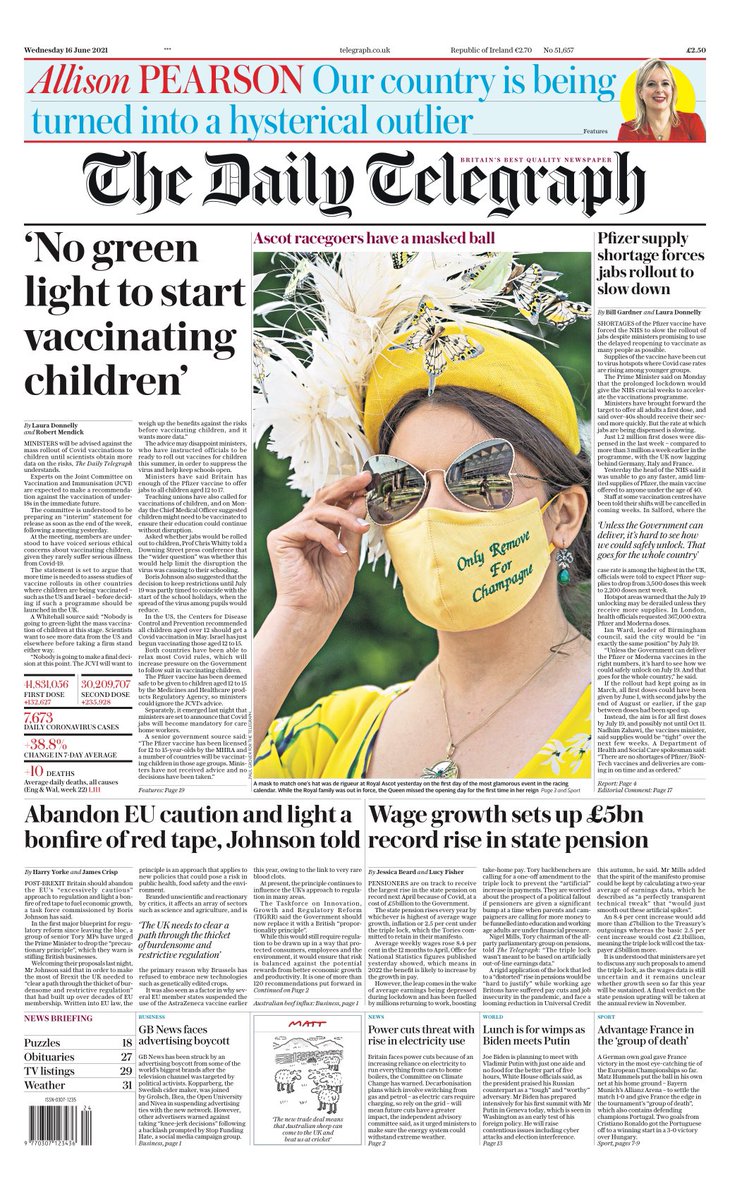 Scientists advising ministers on COVID have told them more research is needed before children are vaccinated en masse. That’s the lead in The Daily Telegraph.