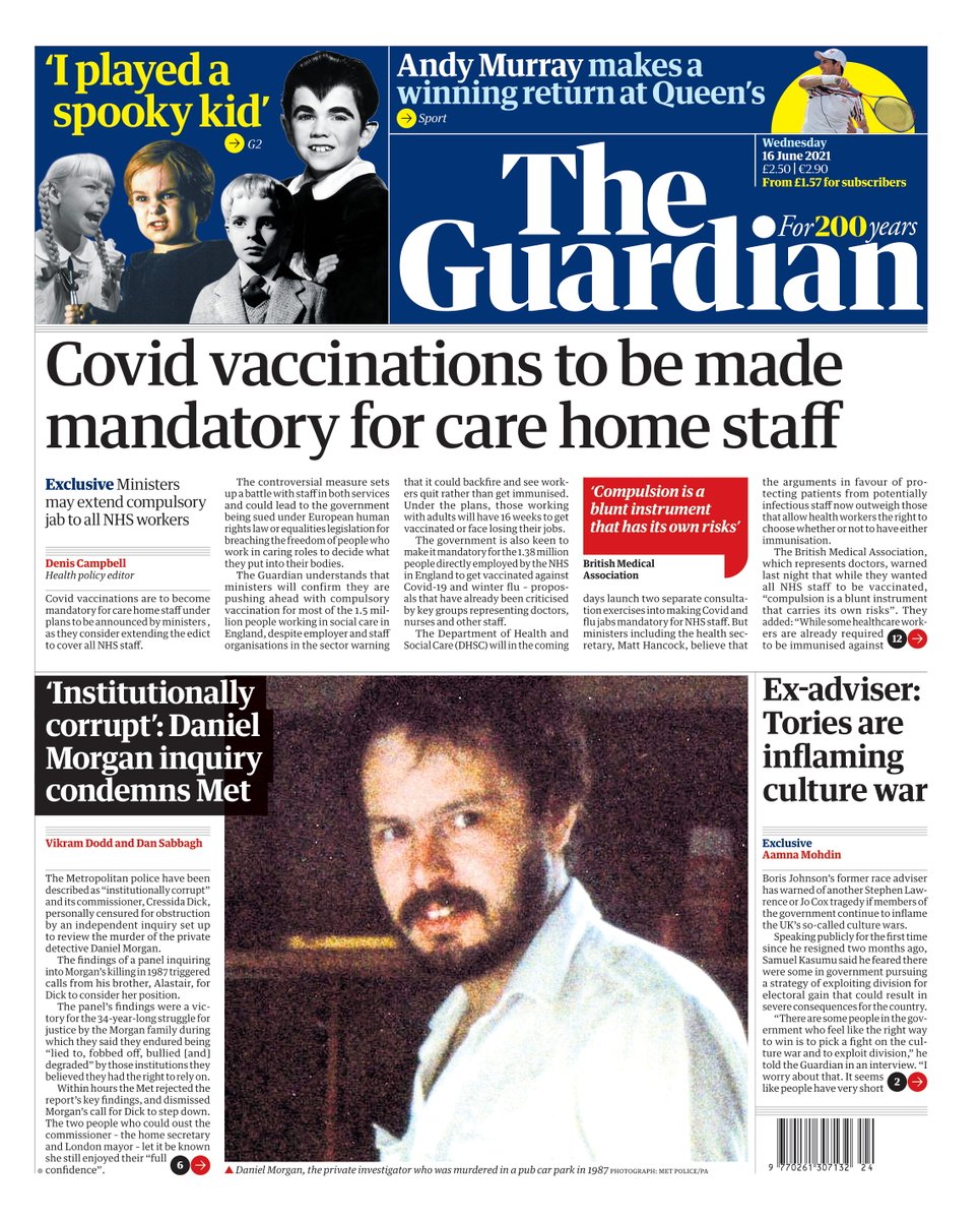 The Guardian says the government could face legal challenges if it opts to force all NHS and care home workers to have COVID vaccine jabs.