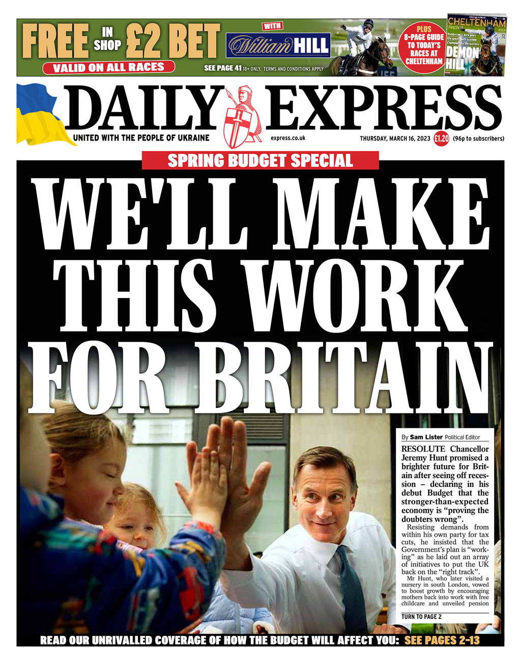A defiantly upbeat budget from Chancellor Jeremy Hunt offers businesses a £9bn tax break, according to the Financial Times.