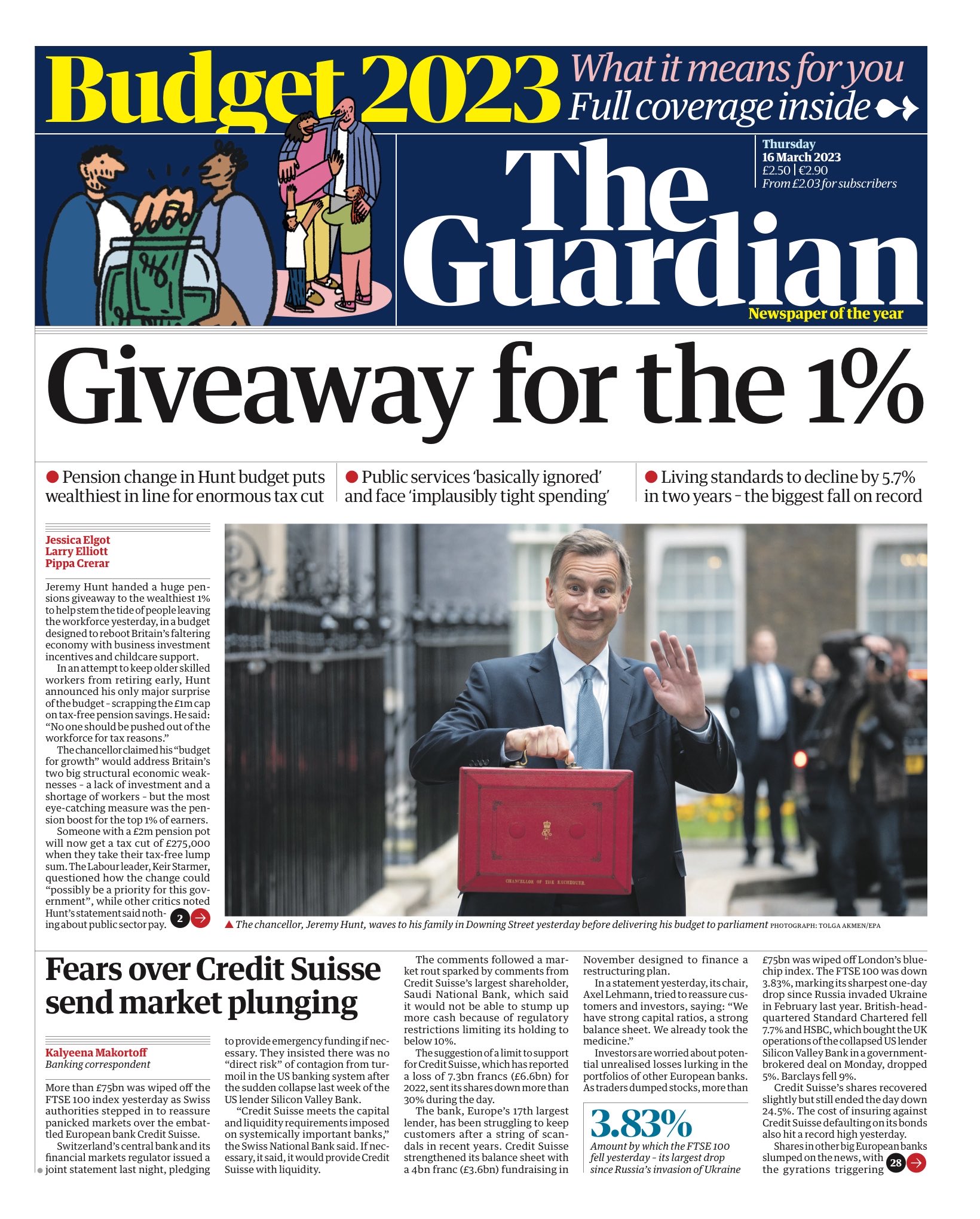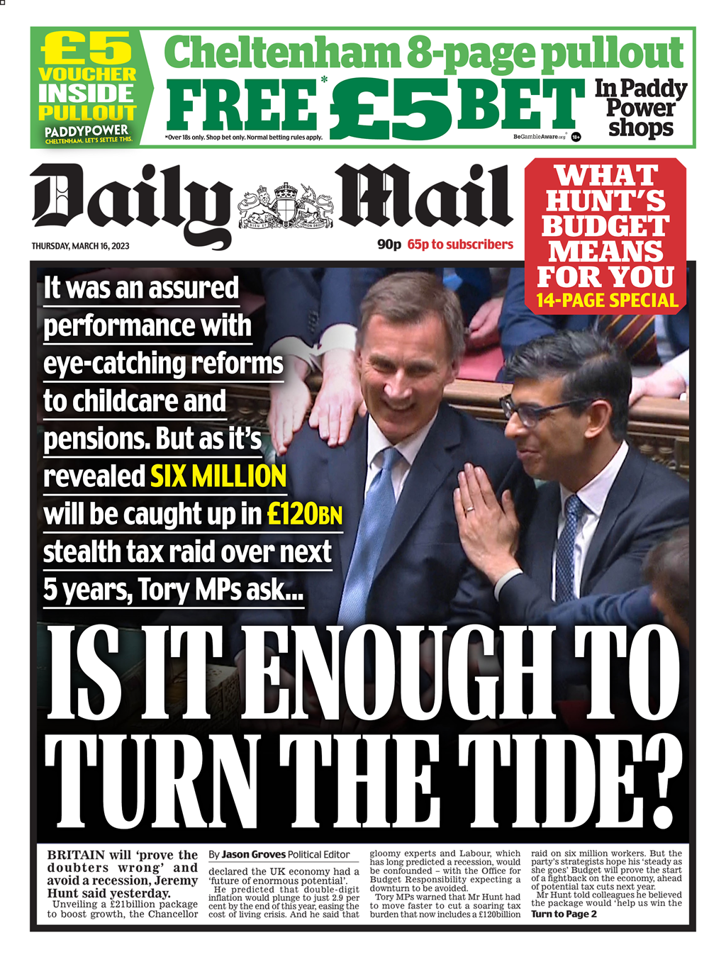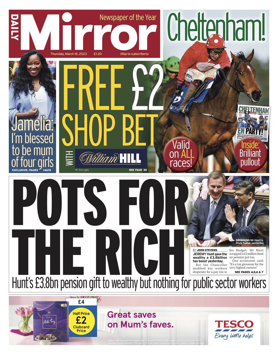 A £3.8bn tax boost was given to the wealthy by Chancellor Hunt in his budget and the chancellor “snubbed” key workers in need of a raise, according to the Daily Mirror.