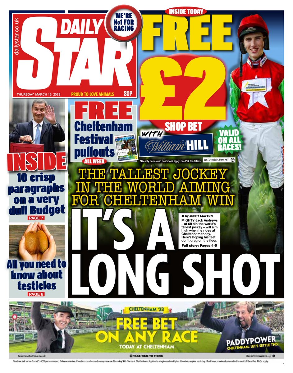The Daily Star reports that 6ft 4in Jack Andrews is hoping to win at Cheltenham.