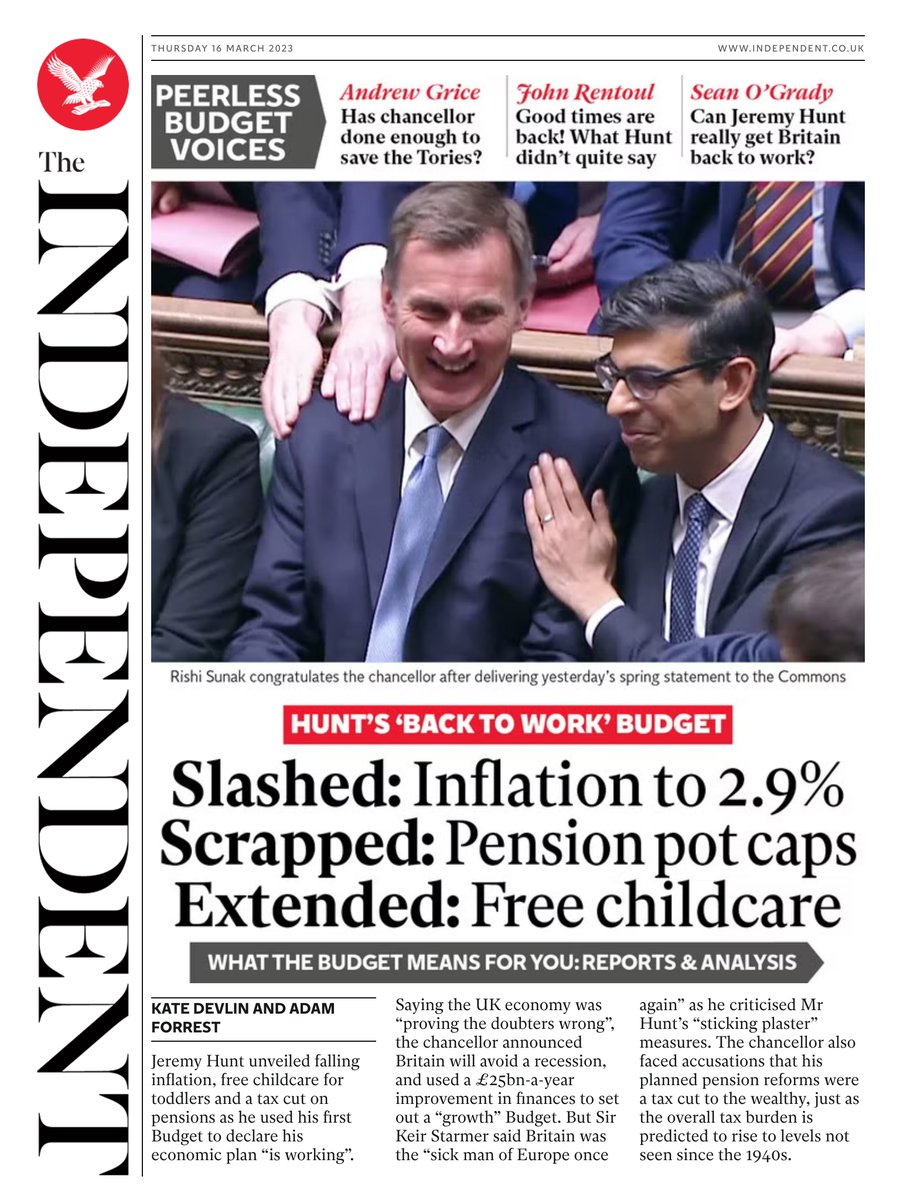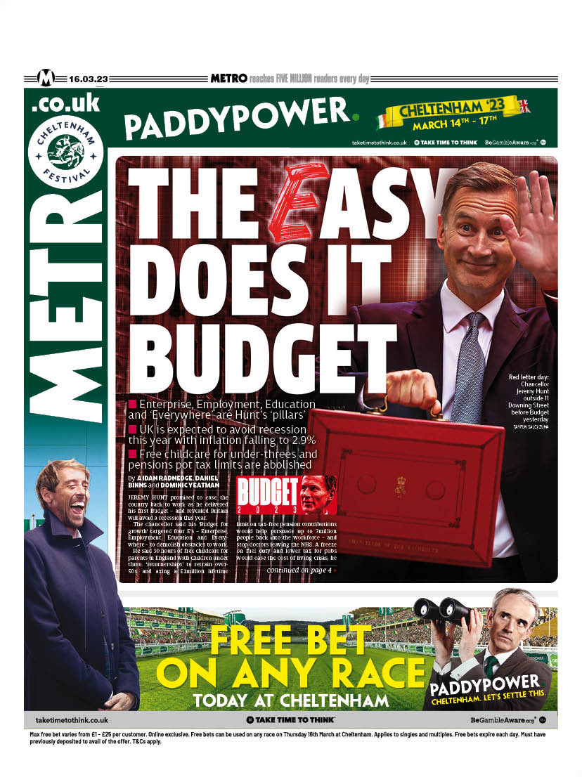 The Metro calls today’s budget announcement the “easy does it budget,” noting that inflation is expected to fall to 2.9% in the UK this year.