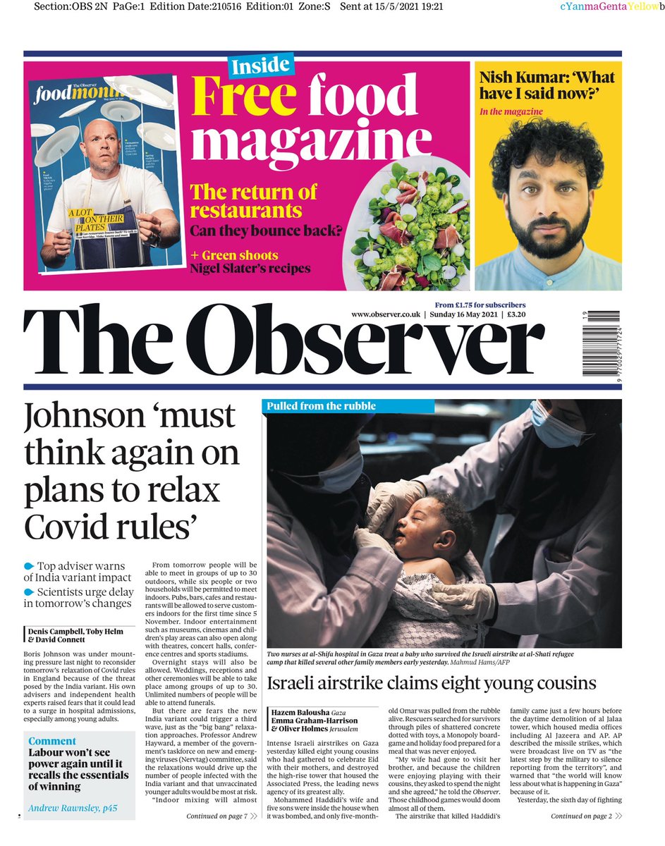 The Observer writes that Boris Johnson is under mounting pressure to reconsider Monday’s relaxation of COVID-19 rules in England because of the threat posed by the India variant.