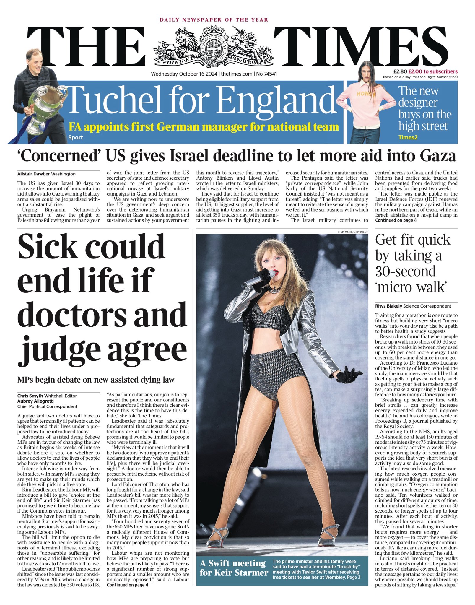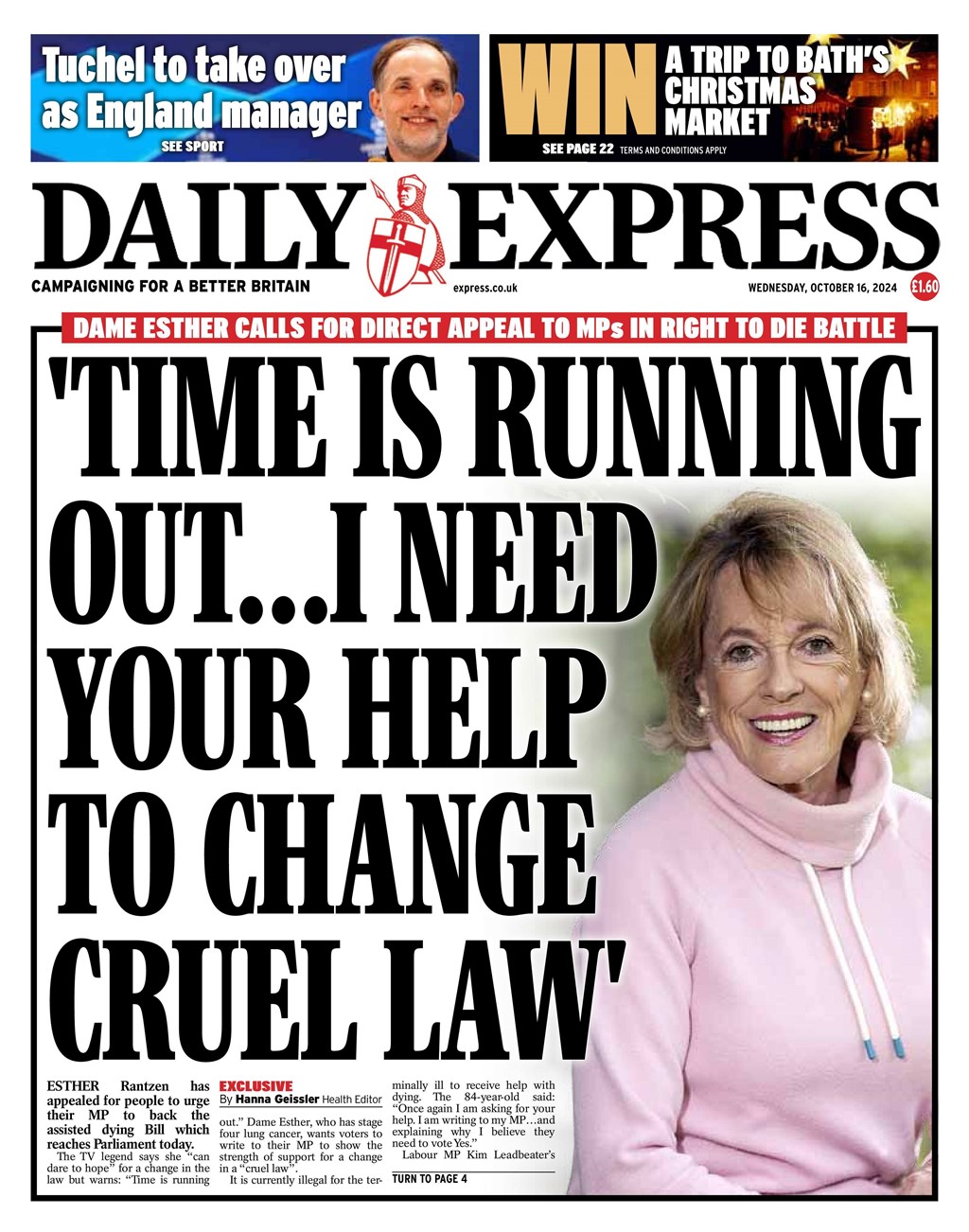 The Daily Express reports that Esther Rantzen is urging the public to contact their MPs in support of the assisted dying Bill ahead of its parliamentary discussion on Wednesday.