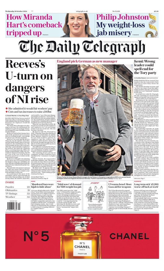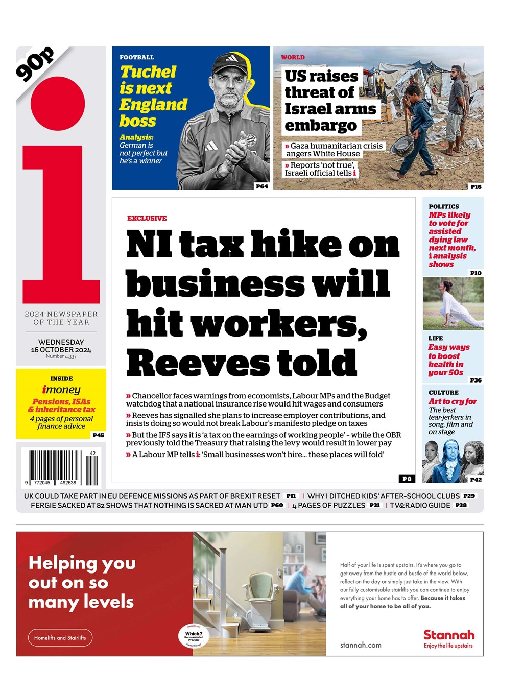 The i highlights warnings from economists and Labour MPs to the chancellor that a national insurance hike may adversely affect wages and consumer spending.