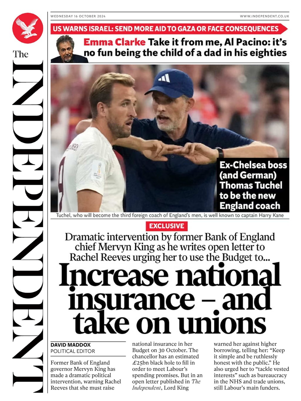 The Independent reports that Mervyn King, former Bank of England governor, advises Chancellor Rachel Reeves to increase national insurance in her upcoming Budget.