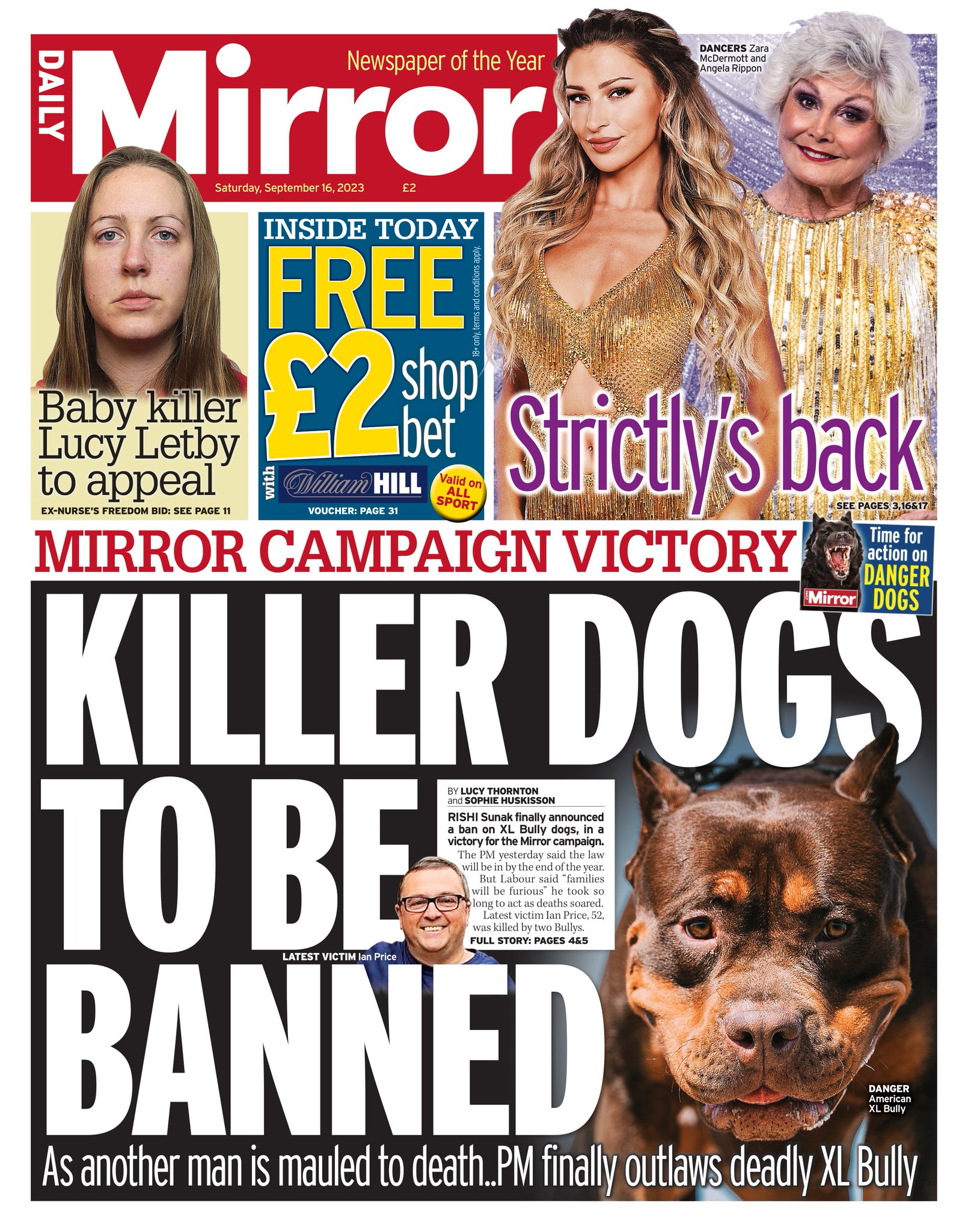 The Daily Mirror highlights Rishi Sunak’s prohibition on XL bully dogs amid criticism over delayed action.