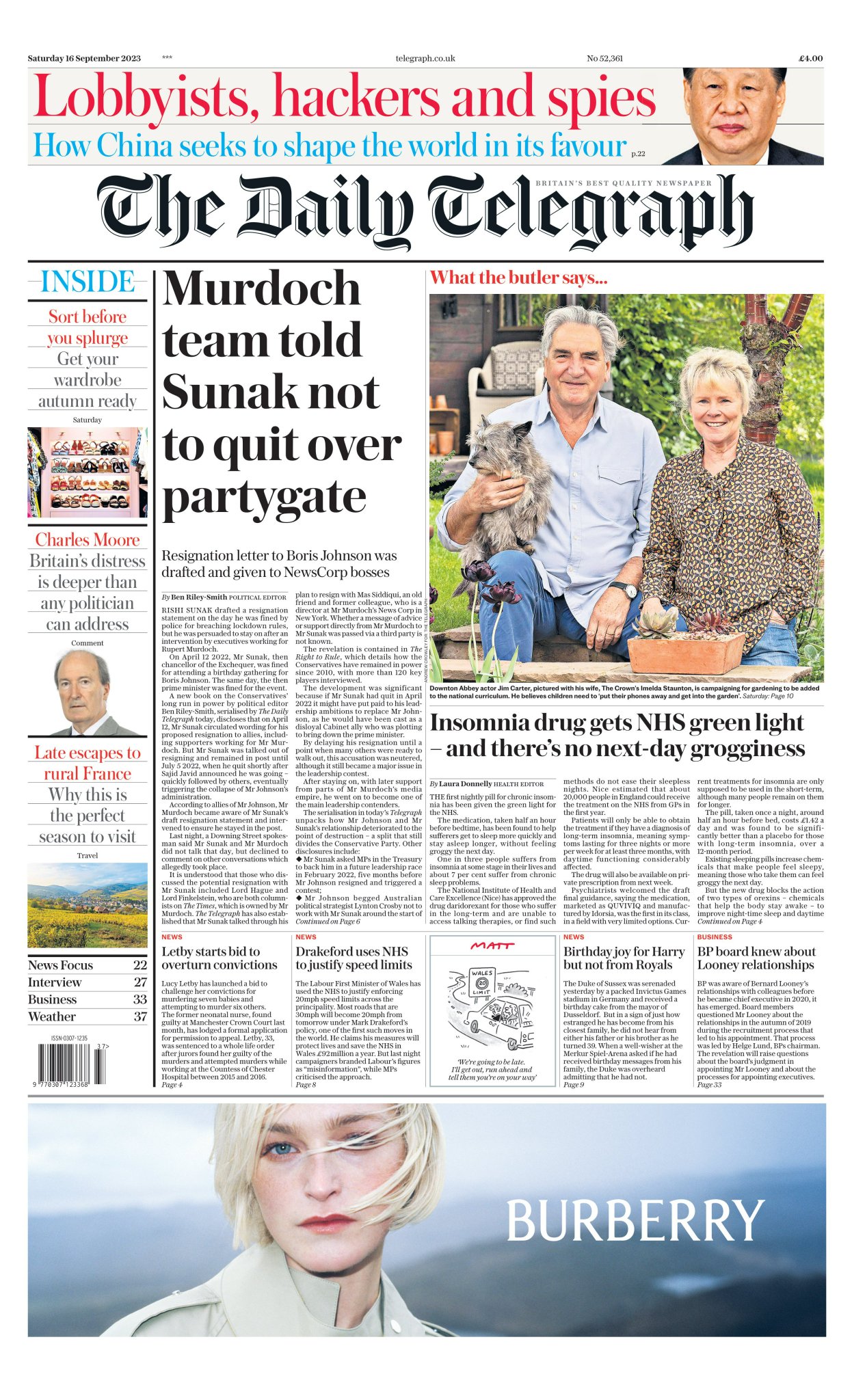The Daily Telegraph reports that Rishi Sunak was dissuaded from resigning over a lockdown breach fine due to Rupert Murdoch’s executives’ intervention.