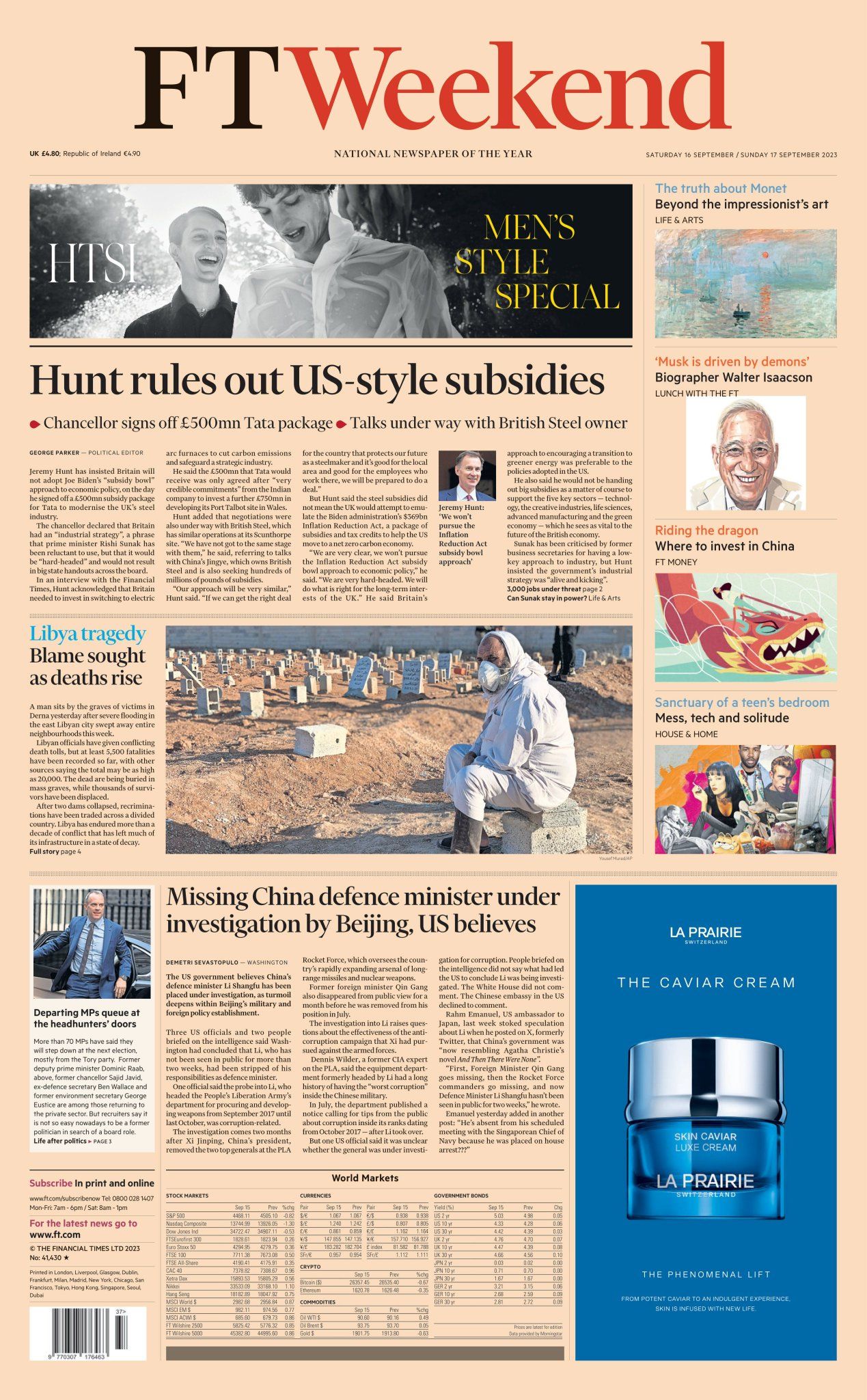 The Financial Times highlights Chancellor Jeremy Hunt’s refusal to follow President Biden’s ‘subsidy bowl’ economic strategy.