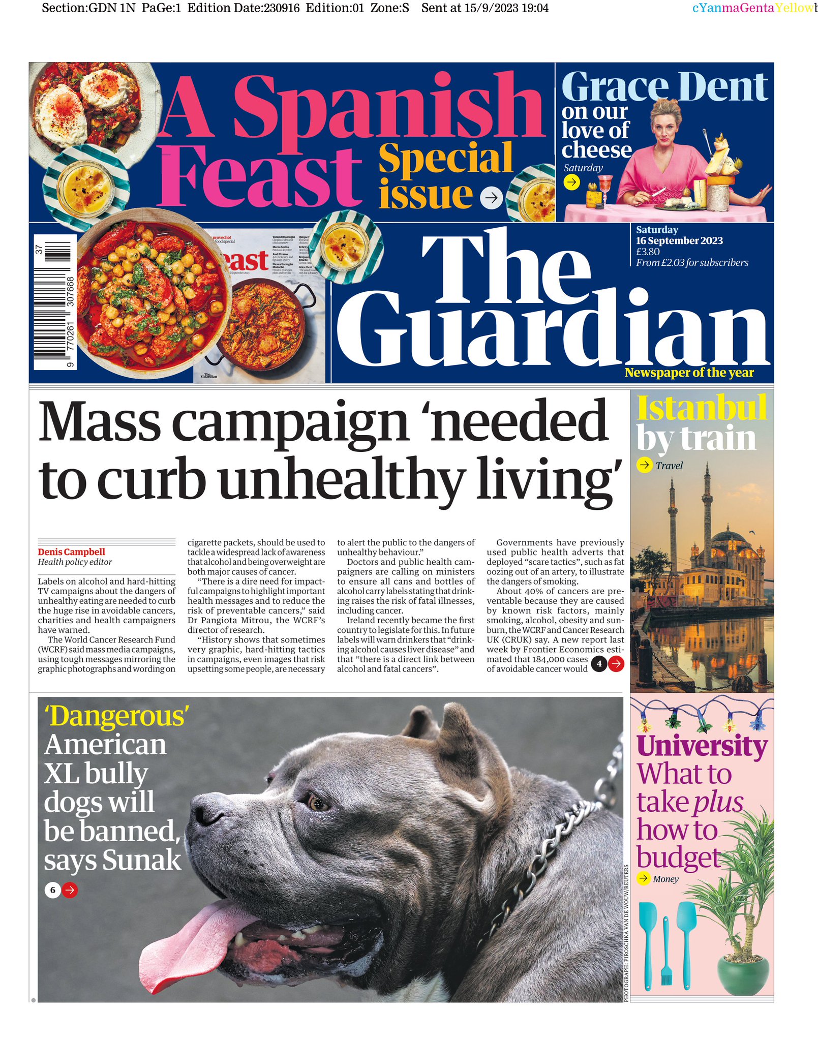 The Guardian highlights the call from charities and health advocates for TV campaigns and labels on alcohol to combat rising avoidable cancers.