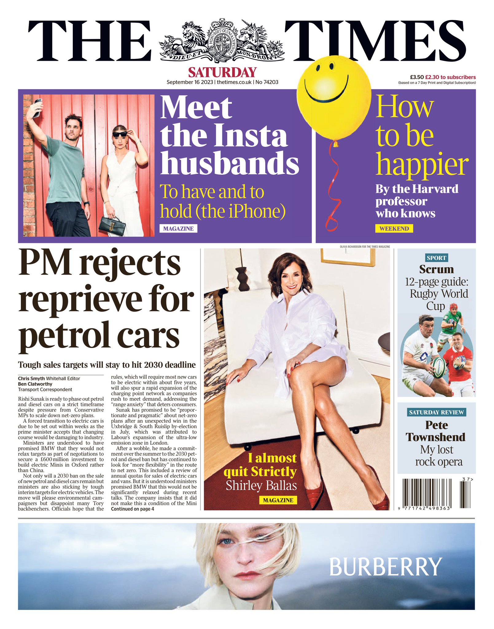 The Times reveals Rishi Sunak’s firm plan to phase out petrol and diesel cars despite Tory MPs’ opposition.