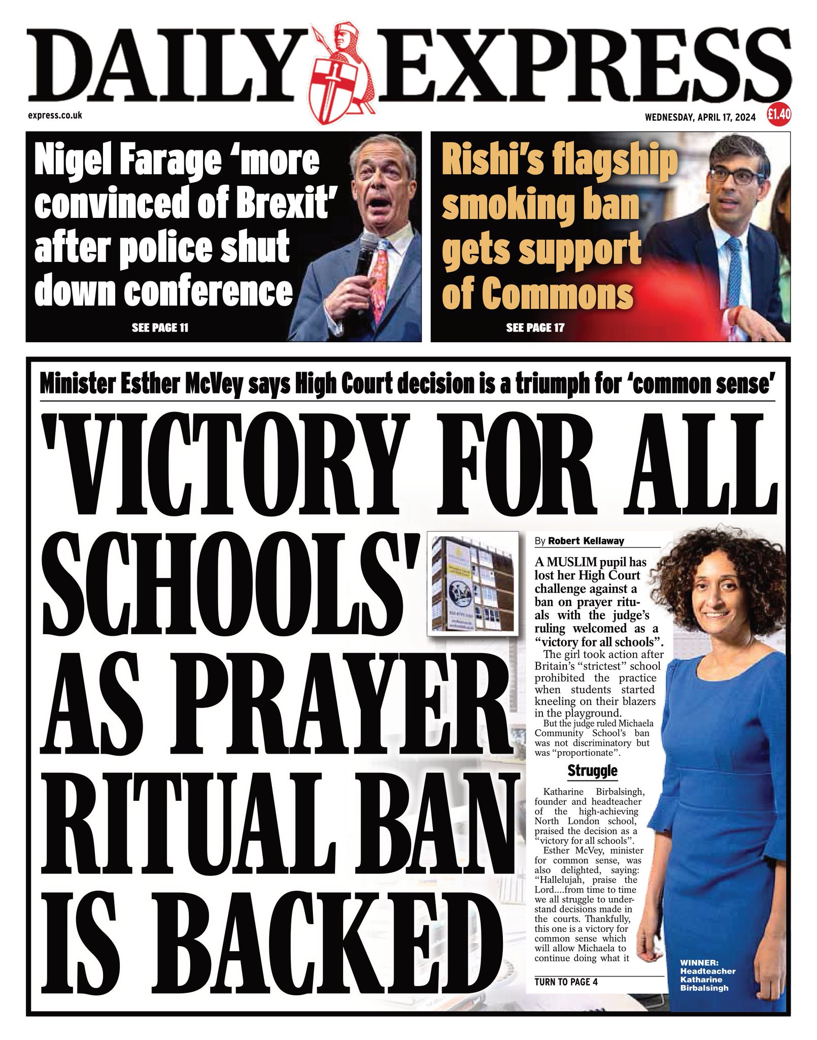 The Daily Express reports a judgement hailed as a triumph for all schools and common sense.