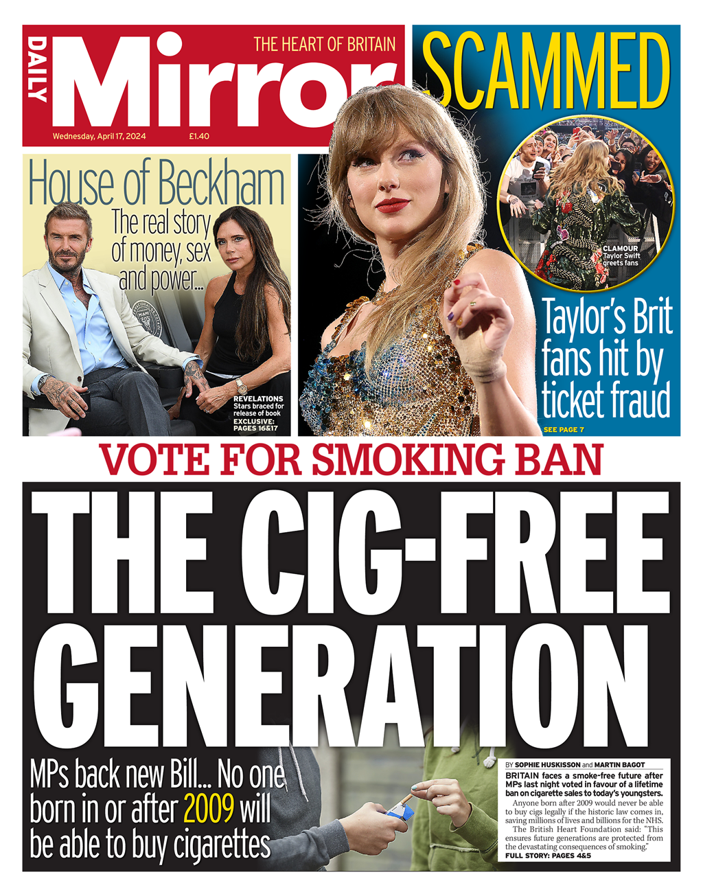 The Daily Mirror reports on MPs voting for a lifetime ban on cigarette sales to today’s youth, signalling a smoke-free future for Britain.