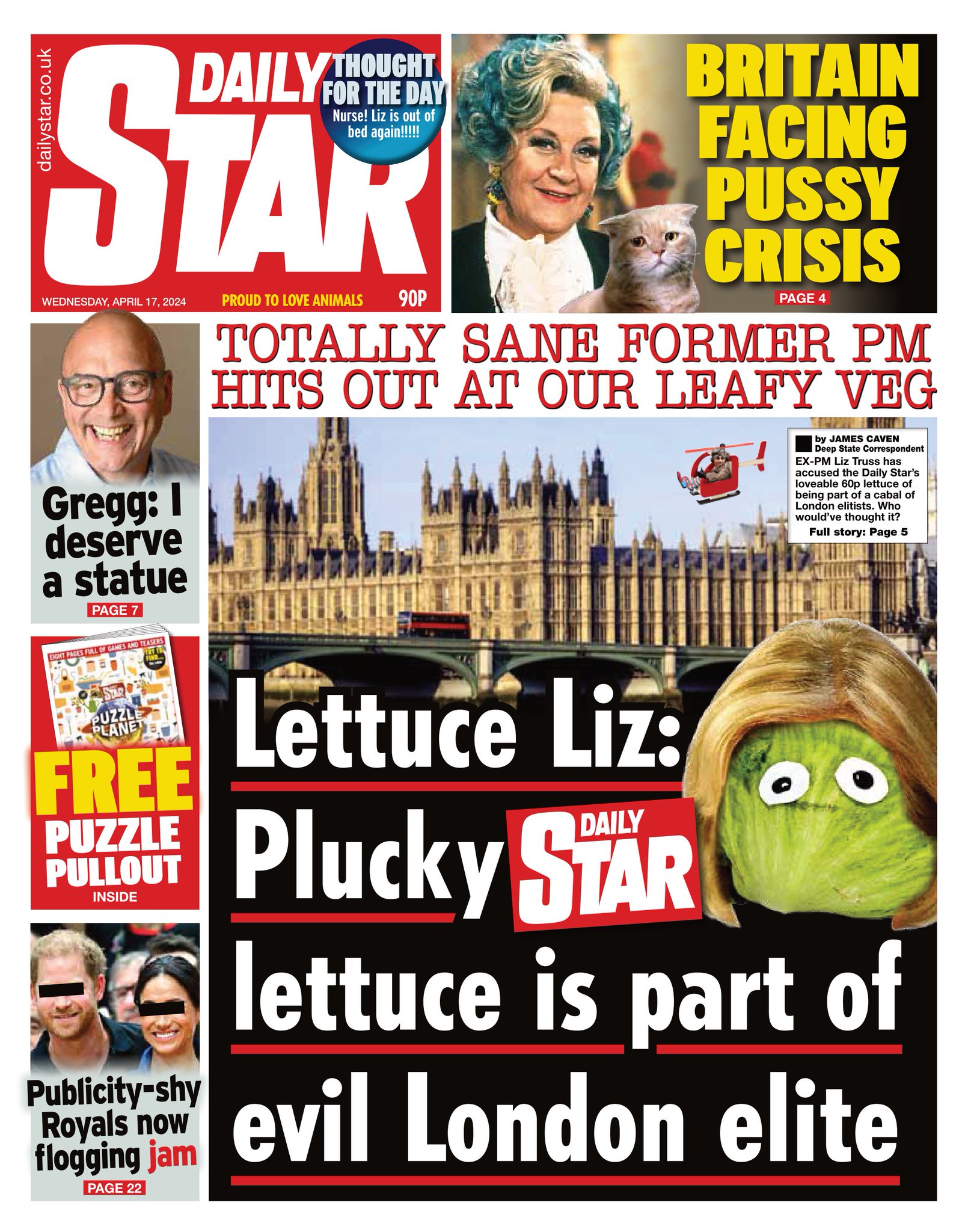 The Daily Star reports on former PM Liz Truss’s allegations of its “lovable 60p lettuce” being linked to London’s elite.