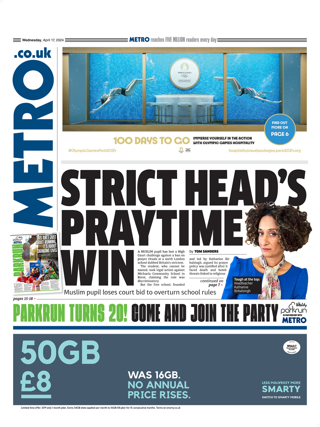 The Metro reports on a Muslim student’s failed High Court attempt to overturn a north London school’s prohibition on prayer rituals.