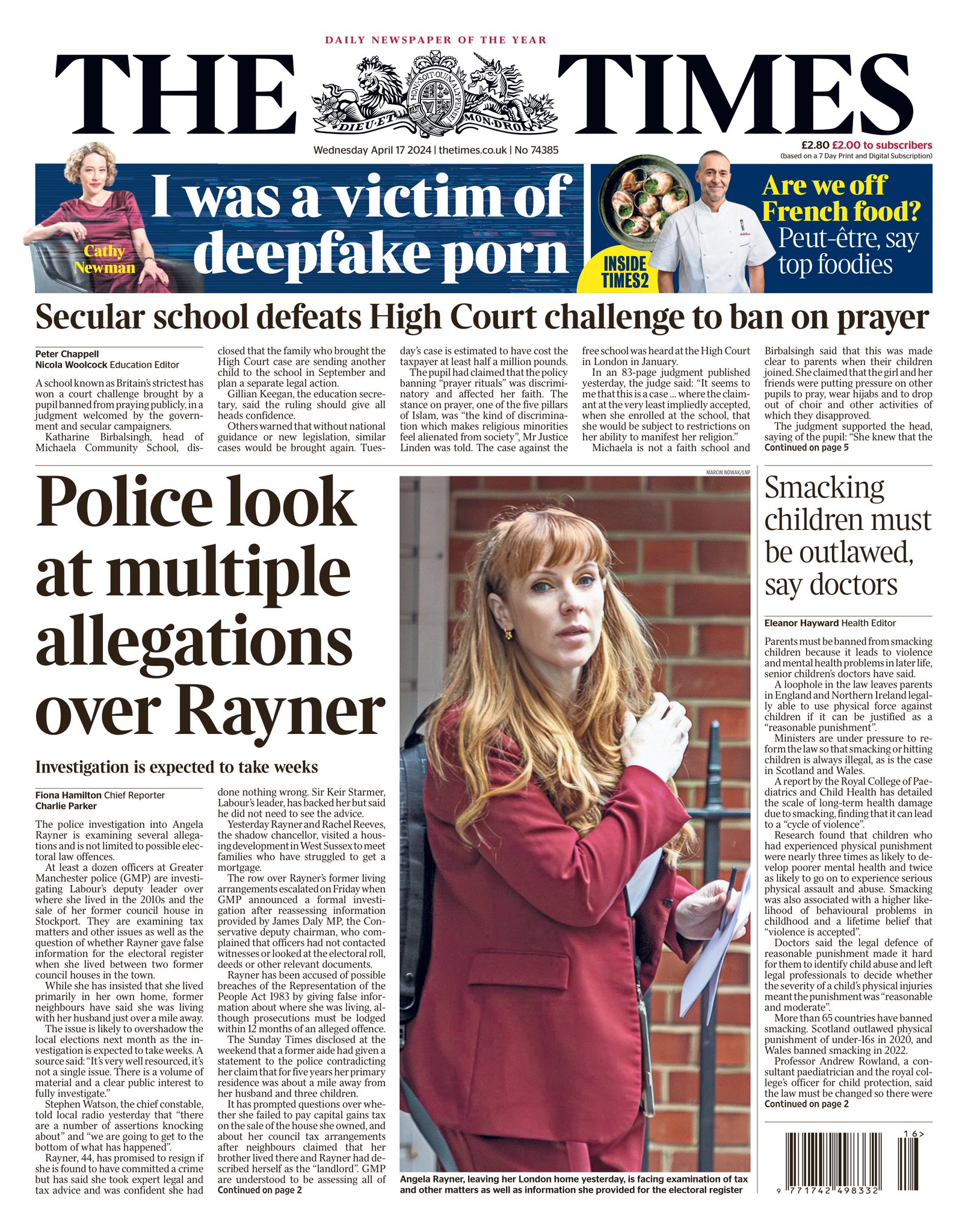 The Times reports on the police’s broad investigation into several allegations against Labour’s deputy leader Angela Rayner.