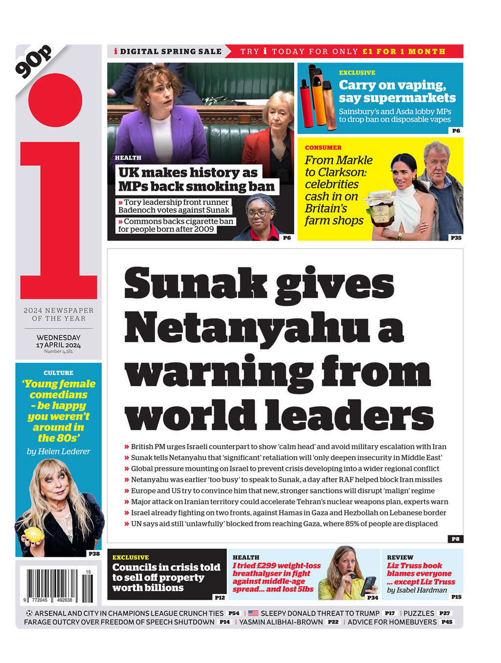 The i paper highlights Rishi Sunak’s caution to Israel’s PM amid worsening Middle East crisis.