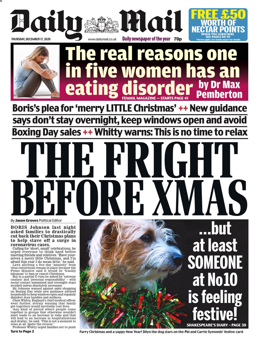 The Daily Mail’s headline is “the fright before Christmas”, which describes Boris Johnson’s warning that families should shorten their Christmas celebrations.People across the UK were told not to stay overnight with their ‘Christmas bubble’, keep windows open and don’t gather in large crowds for the Boxing Day sales.Read our full story on the government’s Christmas guidelines here.