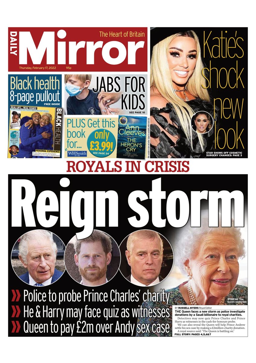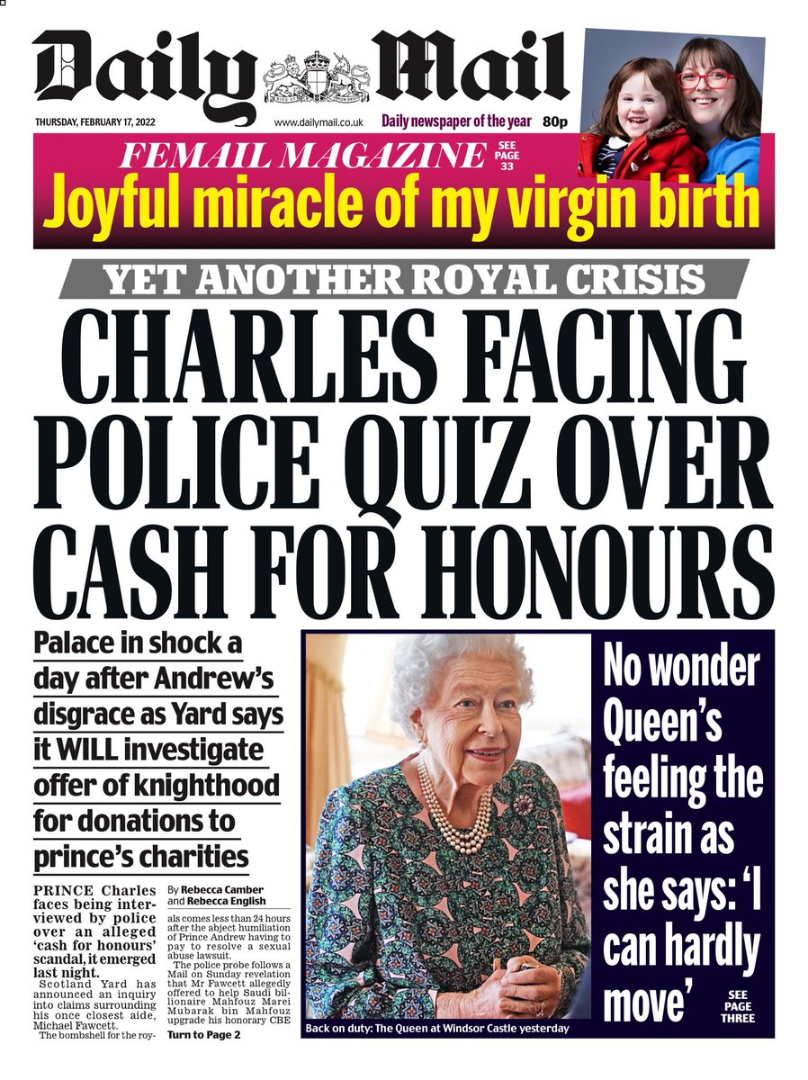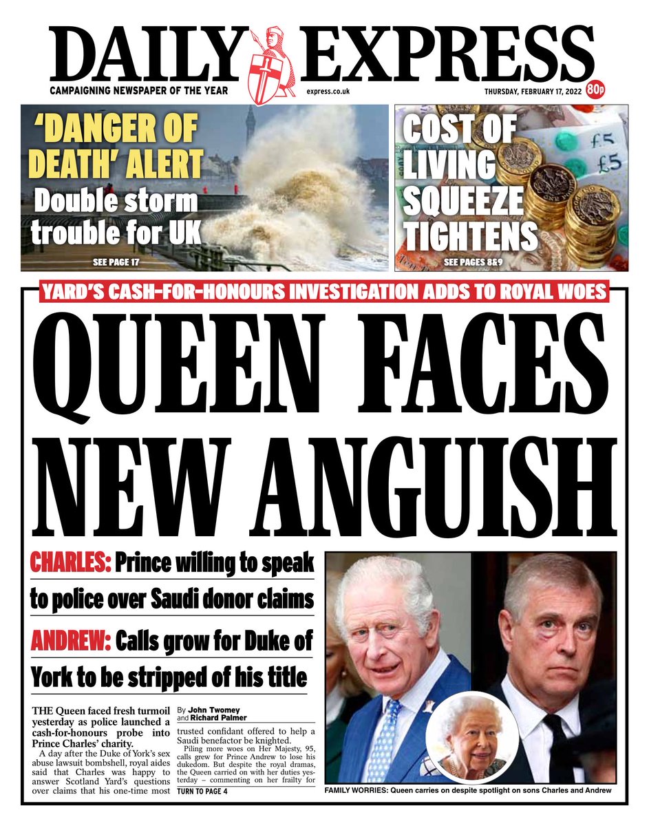 The Daily Express also leads on the news that the Prince of Wales’s charity is facing a police probe.