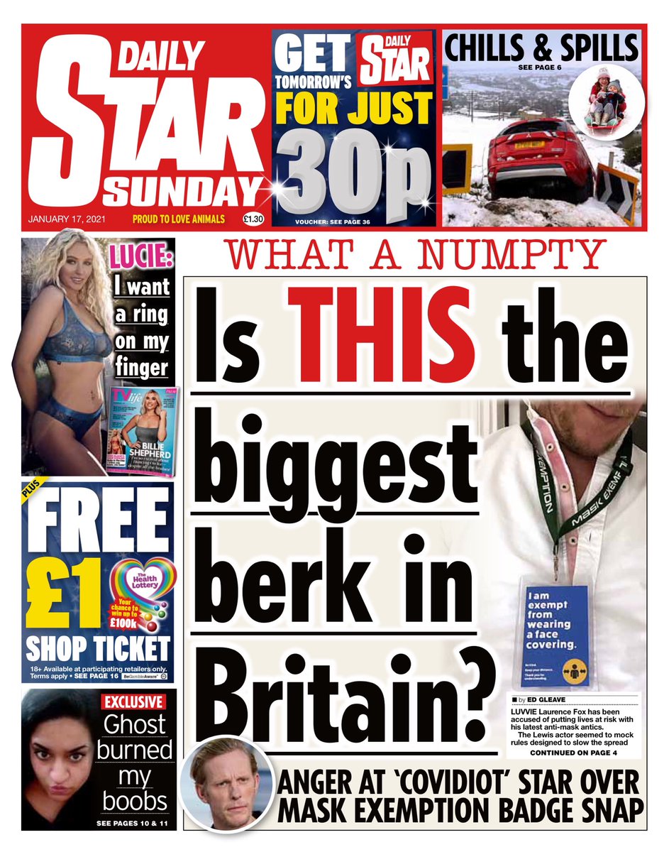 Is Laurence Fox the biggest berk in Britain? That’s the question posed by the Daily Star Sunday.
