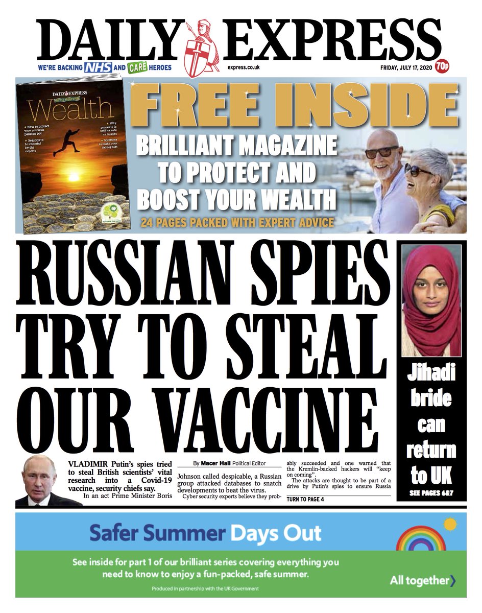 The Daily Express quotes a security expert as saying Russian spies will “keep on coming” after Moscow was accused by security officials of trying to hack into the UK’s coronavirus vaccine research.
