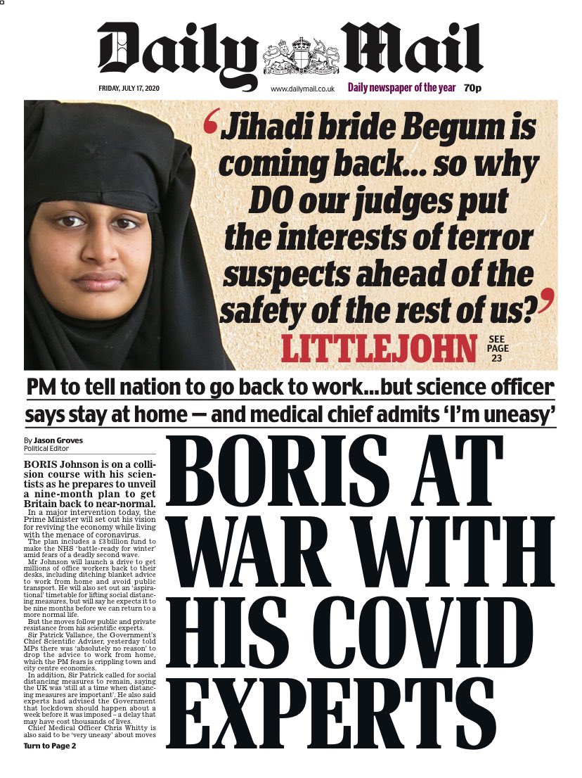 The Daily Mail looks ahead to Boris Johnson’s plans to get the UK back to near normal, to be set out later, and says the prime minister is at odds with two of his key health advisers.