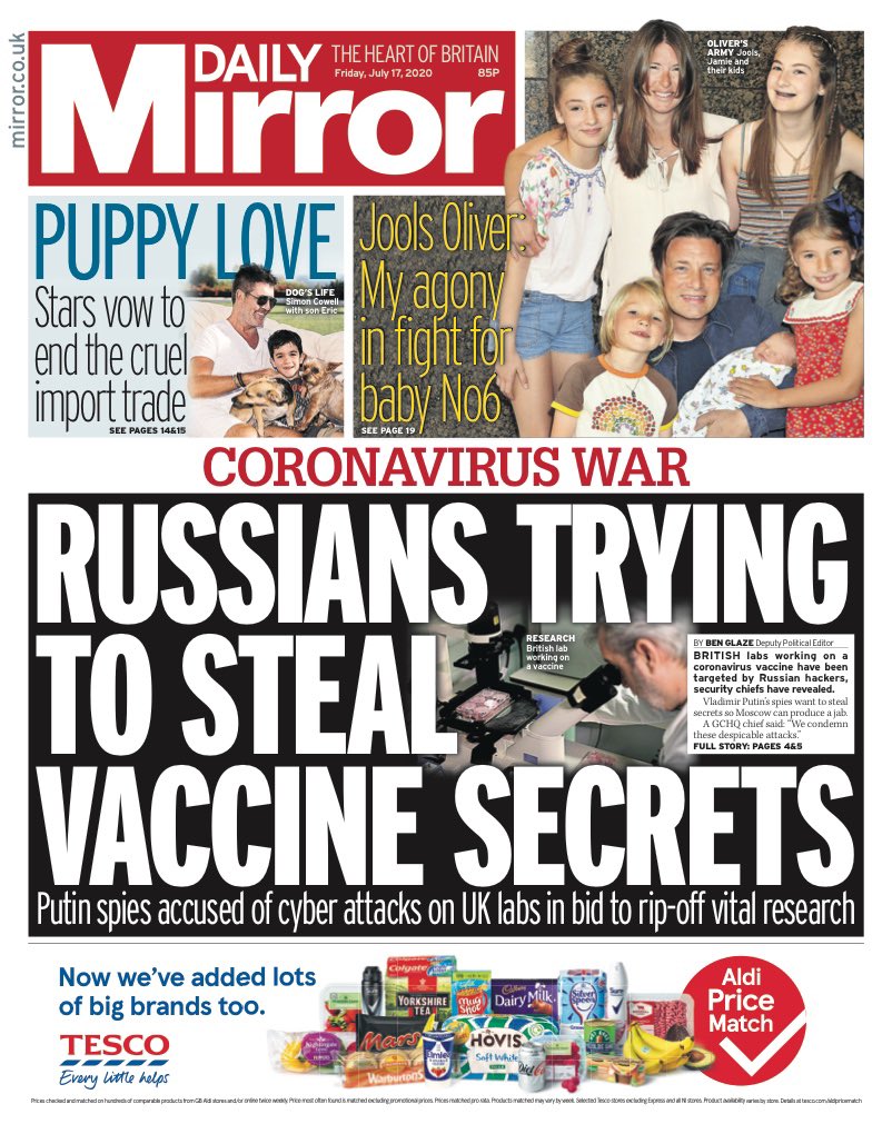 The Daily Mirror says Vladimir Putin’s spies “are trying to steal vaccine secrets” after the alleged hacking of coronavirus research labs.