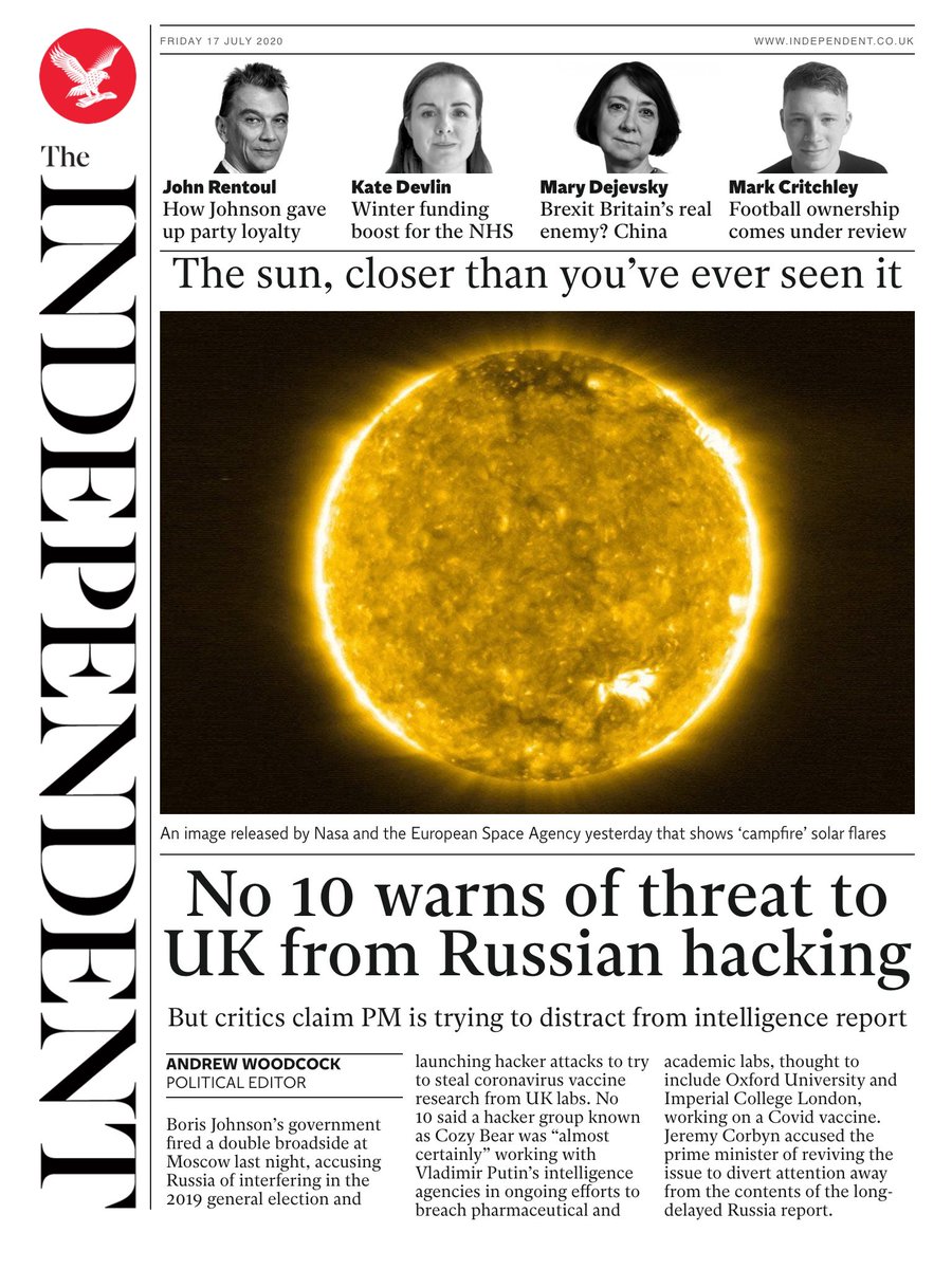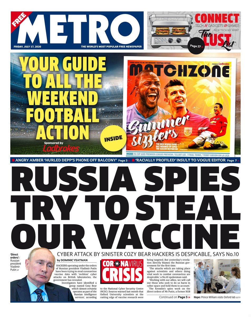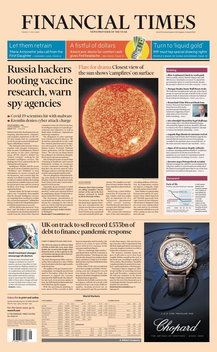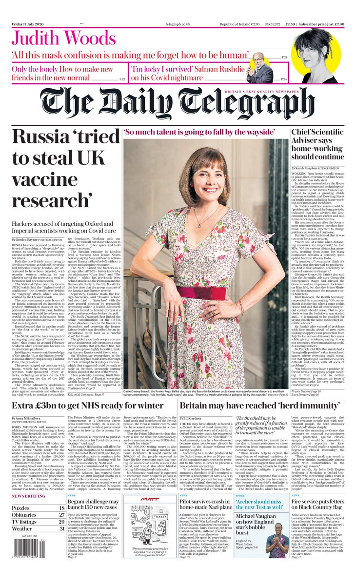 The Financial Times leads on reports that Russian intelligence operatives are allegedly trying to steal coronavirus vaccine research, saying scientists have been hit by malware.