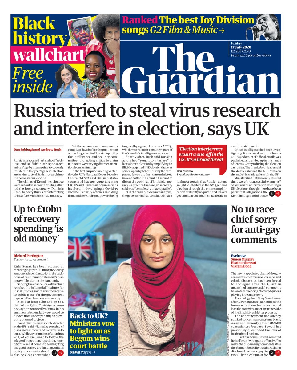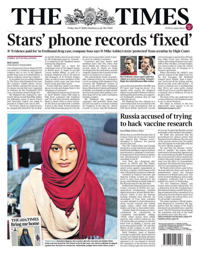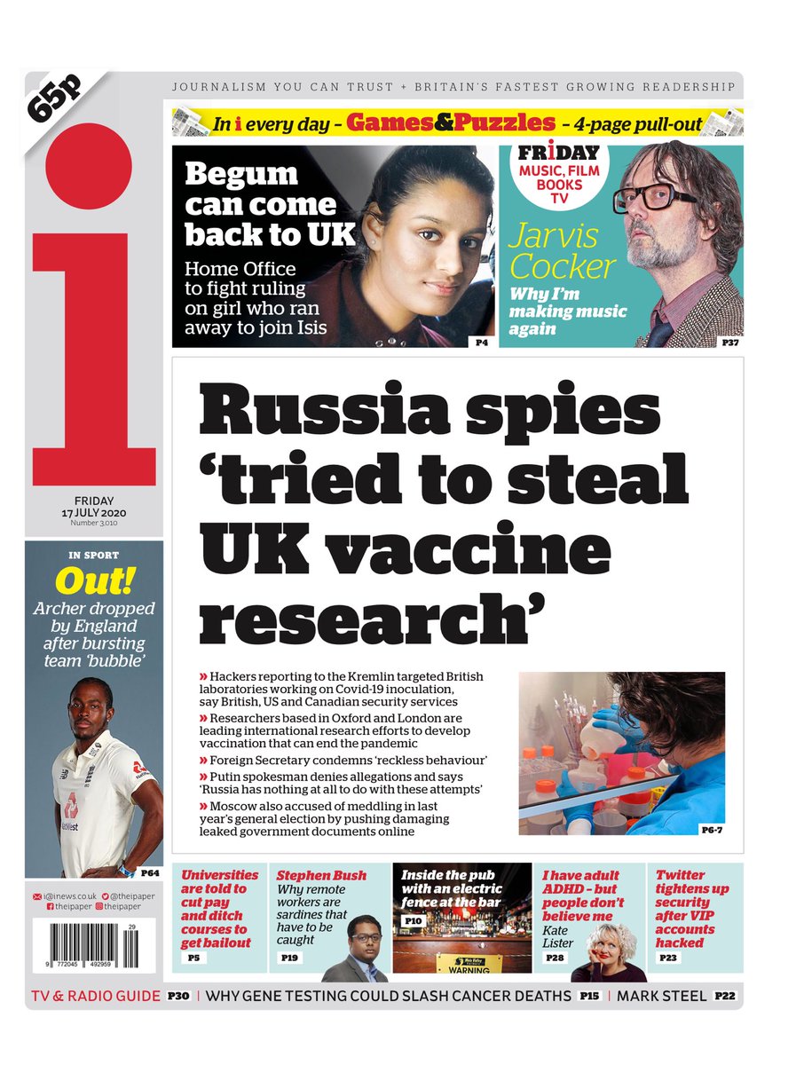 The Financial Times leads on reports that Russian intelligence operatives are allegedly trying to steal coronavirus vaccine research, saying scientists have been hit by malware.