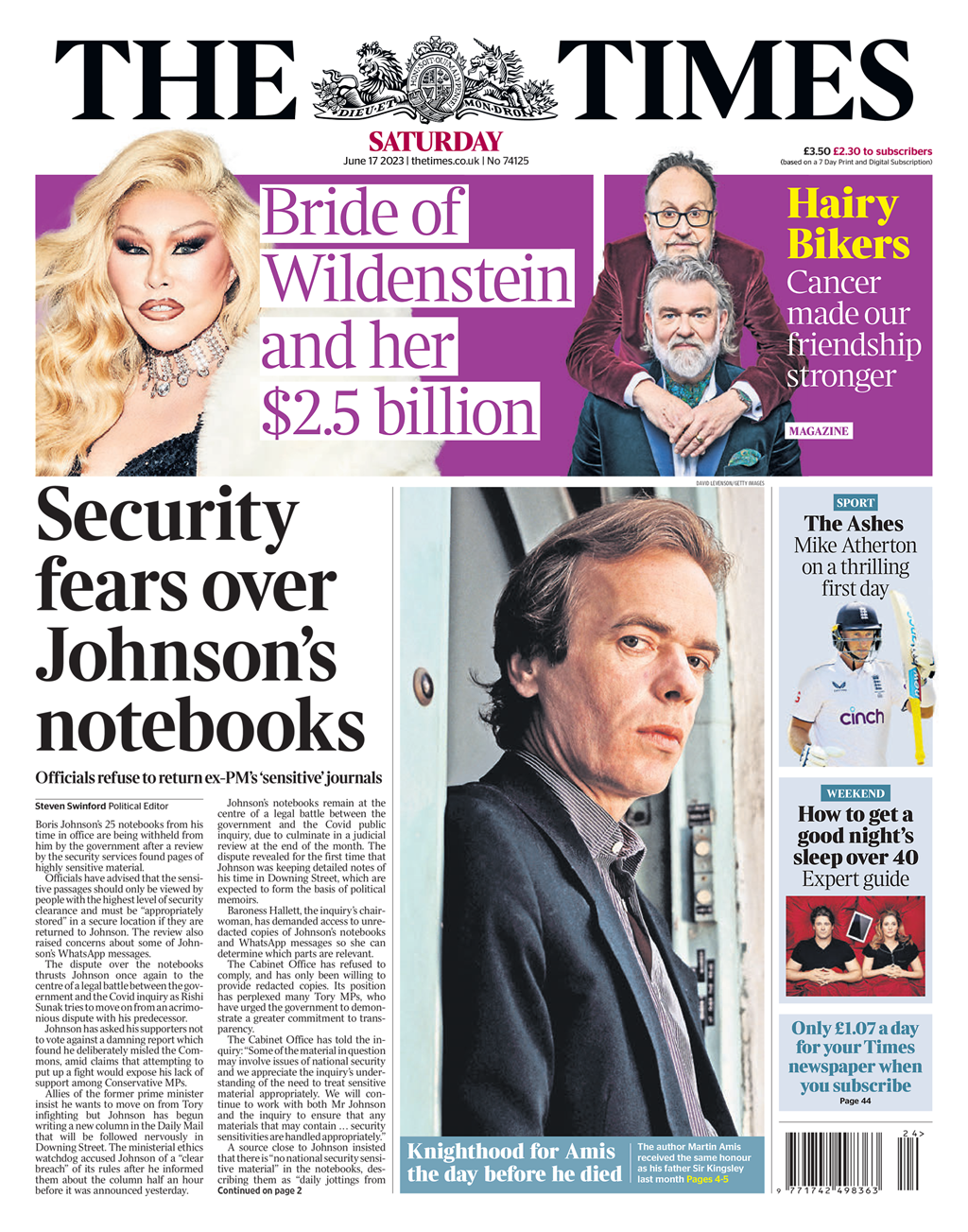 The Times highlights that Boris Johnson’s notebooks from his term as PM are being retained due to the presence of “highly sensitive material”.