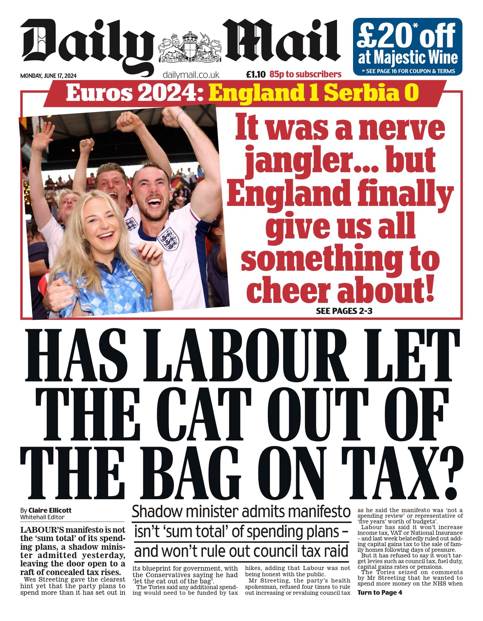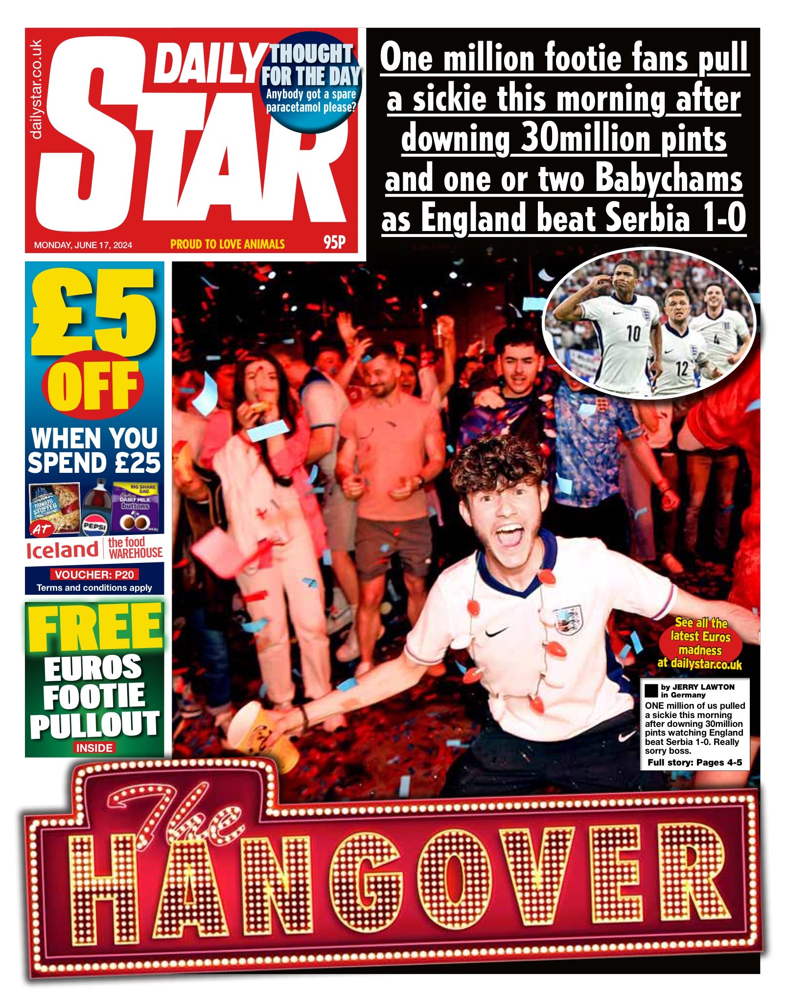 One million football fans called in sick this morning after consuming thirty million pints and a few Babychams as England triumphed over Serbia with a score of 1-0.