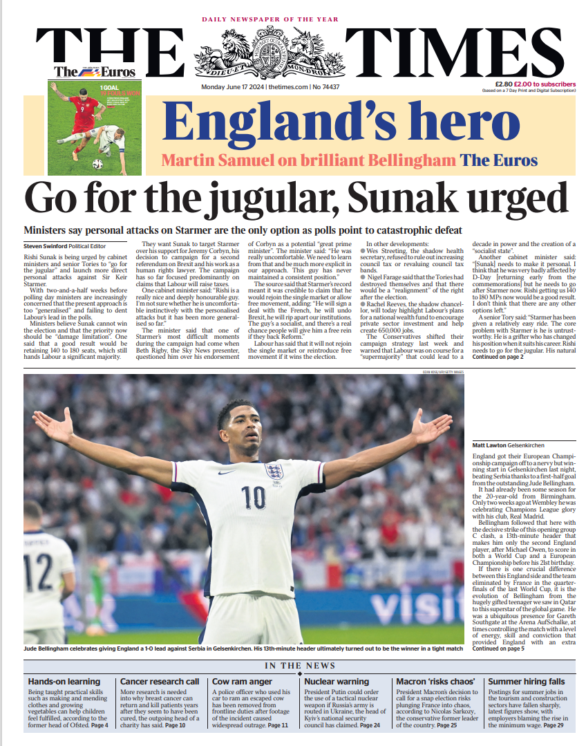 The Times reports Rishi Sunak being urged to launch personal attacks on Sir Keir Starmer due to the Conservatives’ weak polling.