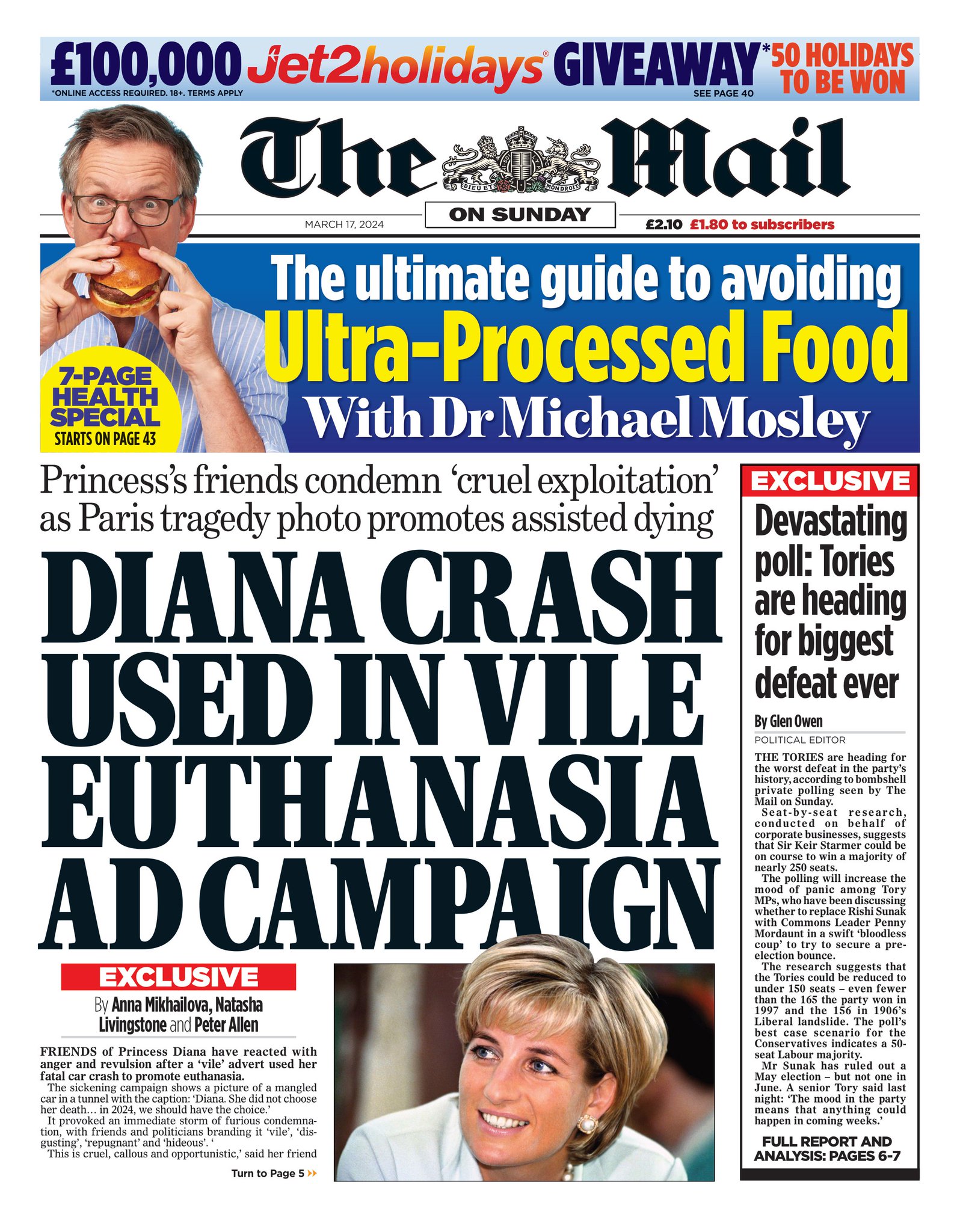 The Mail on Sunday reports on Princess Diana’s friends’ outrage over a French euthanasia advert using an image of a wrecked car in a tunnel.