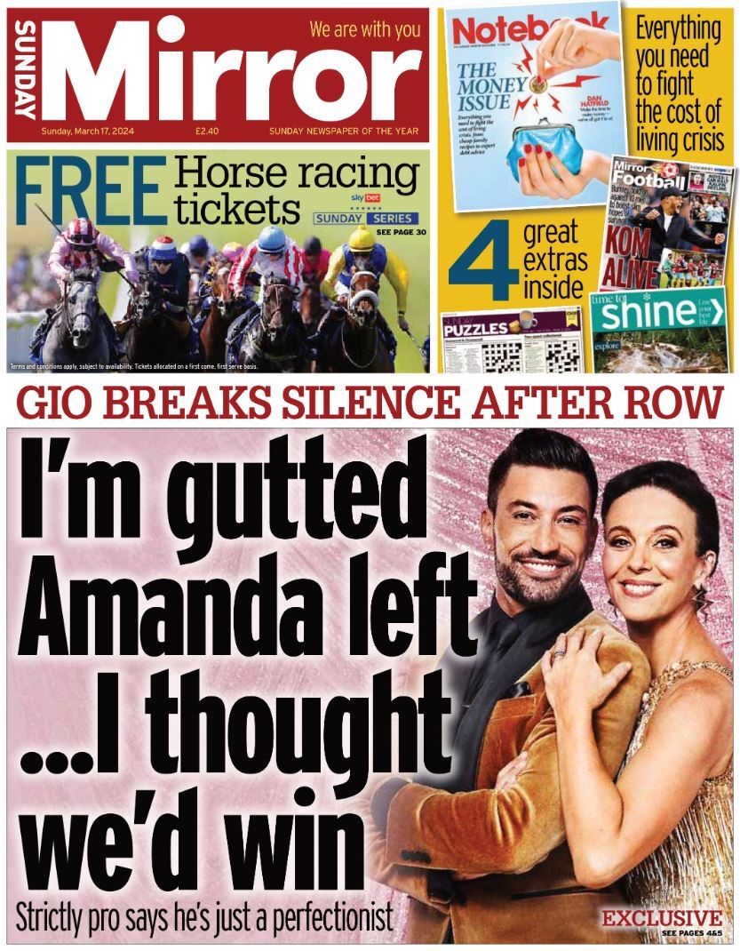 The Sunday Mirror features Giovanni Pernice’s first public comments on Amanda Abbington’s departure from Strictly Come Dancing.