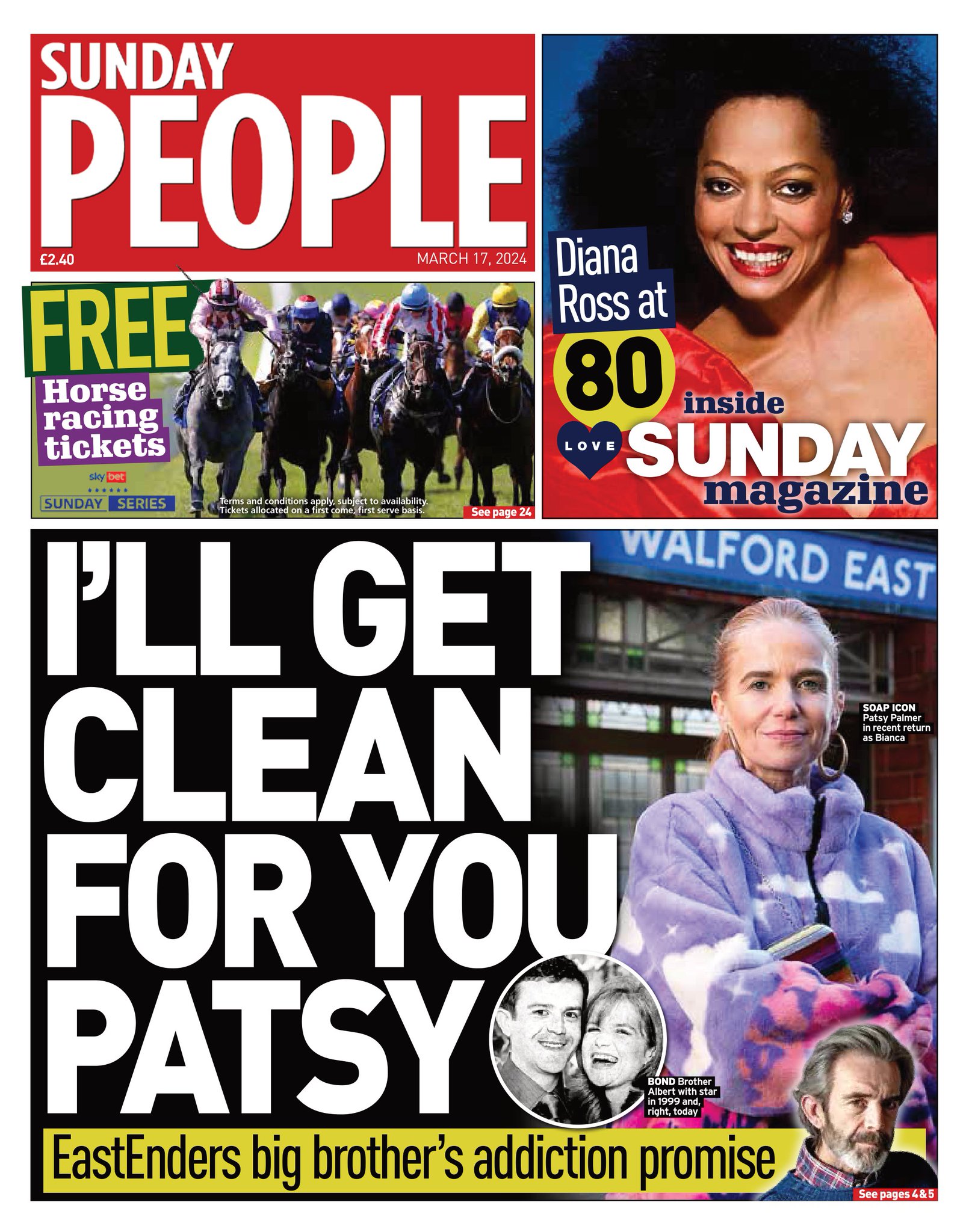 The Sunday People reports Patsy Palmer’s brother’s determination to conquer his alleged drug addiction.