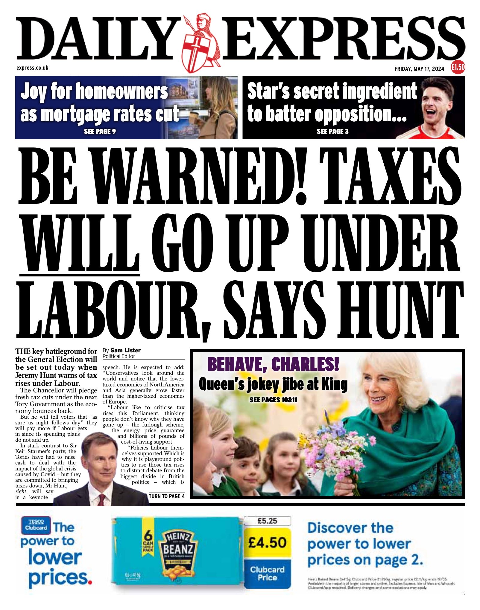 The Daily Express reports that Chancellor Jeremy Hunt promises new tax cuts under the next Tory government.
