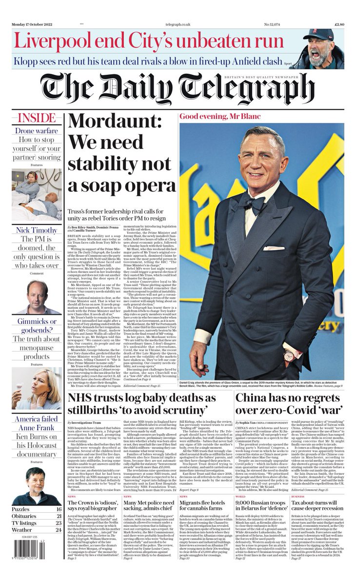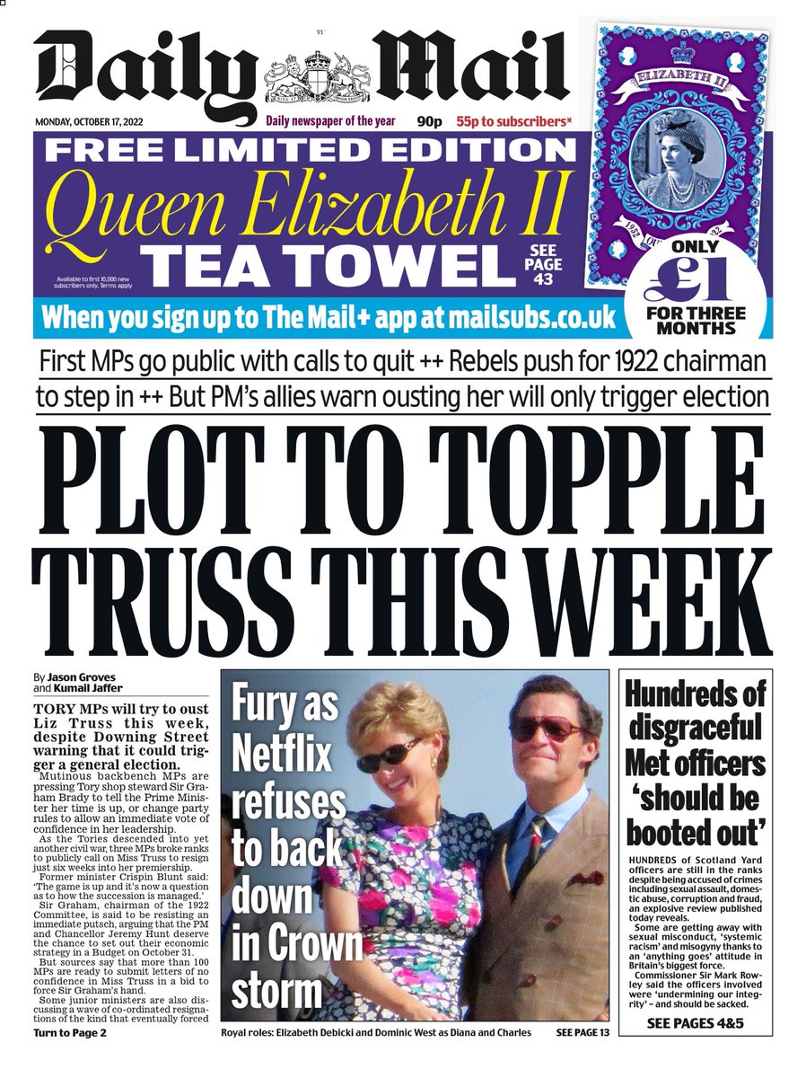 Daily Mail reports that Conservative MPs will try to oust Liz Truss this week, claiming they are “mutinous”.