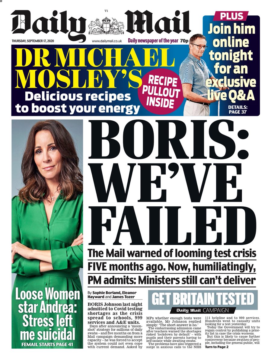 The Daily Express leads on Mr Johnson’s comments but on lockdown restrictions, not testing. The PM said the government will “do everything in our power” to avoid a second national lockdown – but the paper says he refused to rule out a new stay at home rule. He said another lockdown would be “disastrous”.