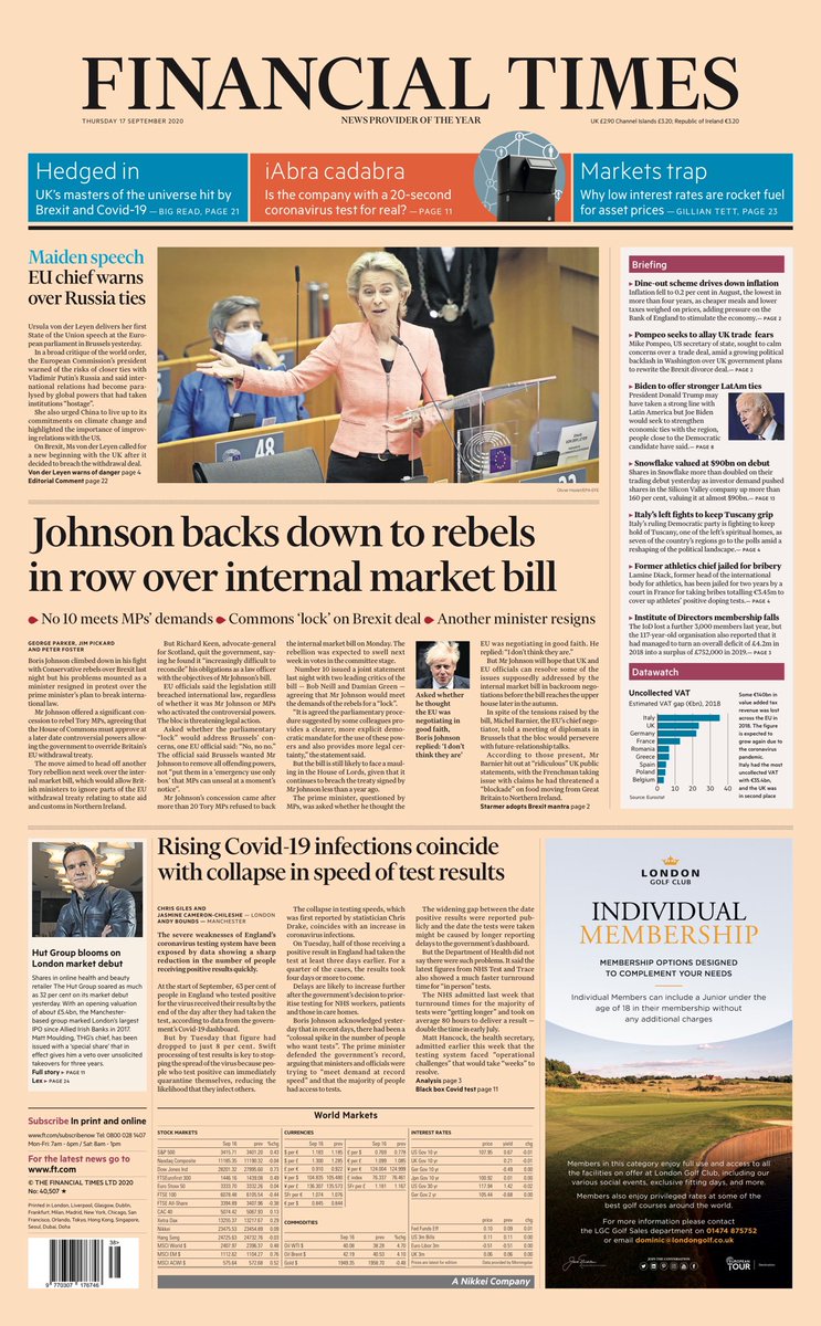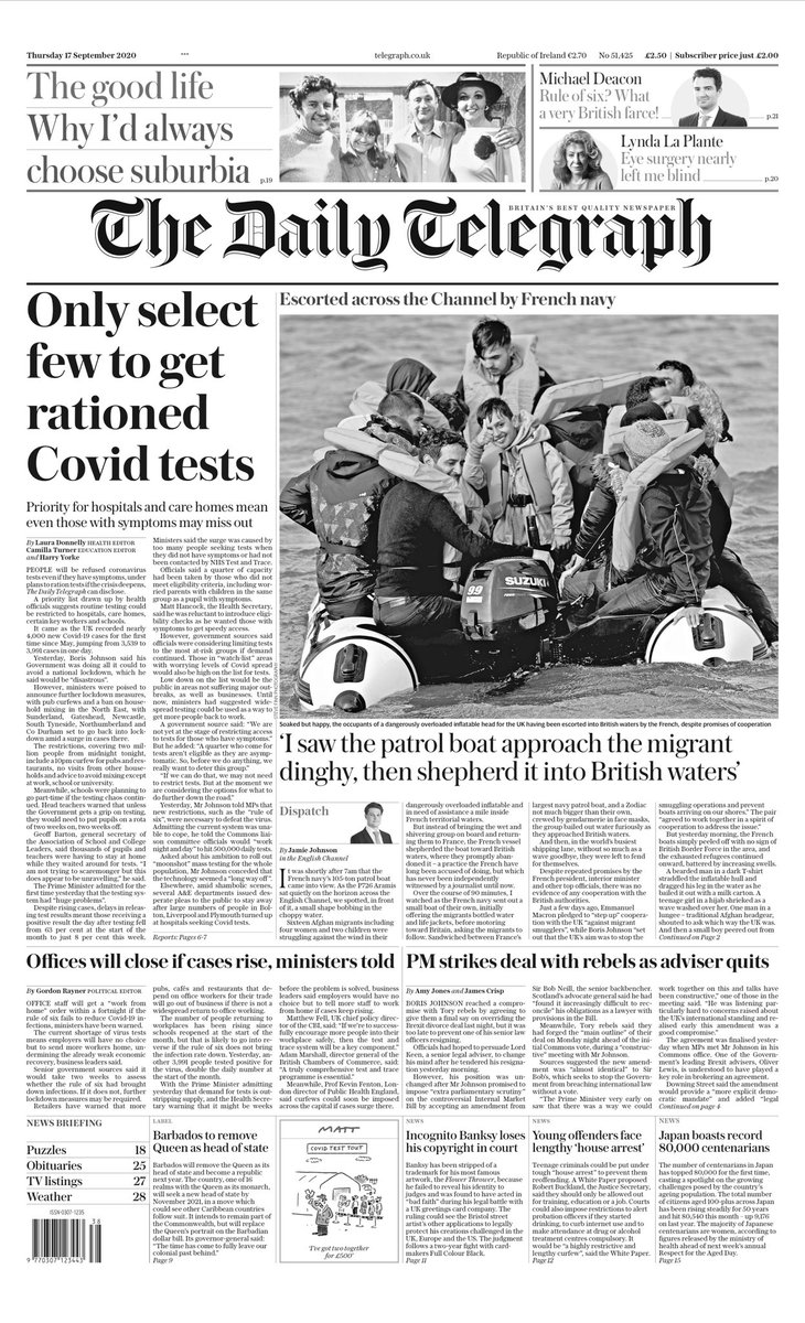 The Daily Mirror says the testing system has “descended into even further chaos”, as it reports that on Wednesday the UK saw its highest daily rise in cases since May. Its headline comes from a tweet by Labour MP Liam Byrne that reads “Tories aren’t testing” – which itself was intended to be based on the Conservatives’ 1979 advert “Labour isn’t working”.