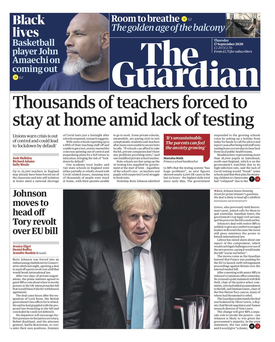 The Guardian focuses on the impact the testing shortage is having on teachers, reporting that up to 25,000 teachers in England may be self-isolating, with many of them unable to get a test. One head of an academy trust said 740 state schools in England were either partially or wholly closed due to coronavirus issues.