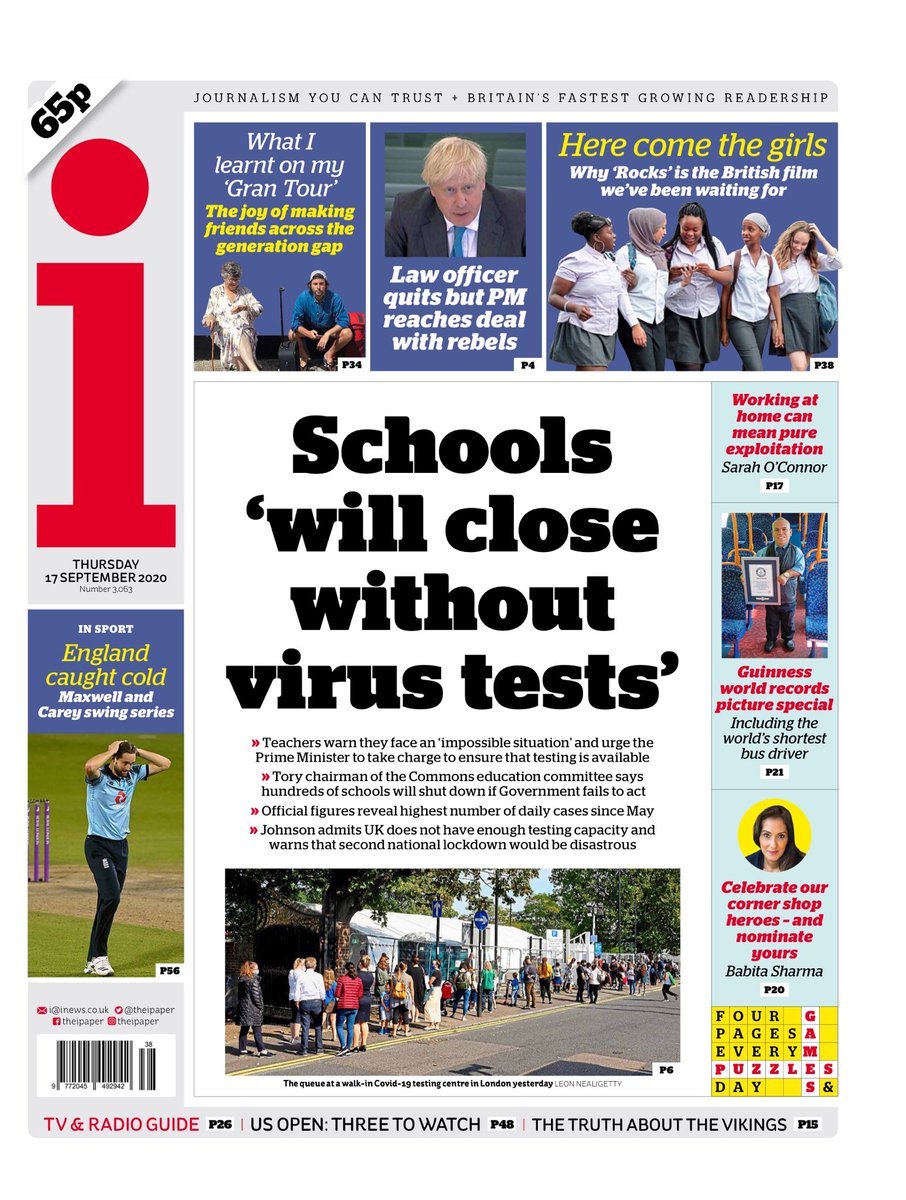 The warning from schools also leads the front of the i newspaper. It reports that head teachers’ unions have written a letter to Mr Johnson telling him to “personally take charge” amid concern over schools not being able to access tests. Teachers have said they are frustrated that the increase in demand was not foreseen, the paper adds.