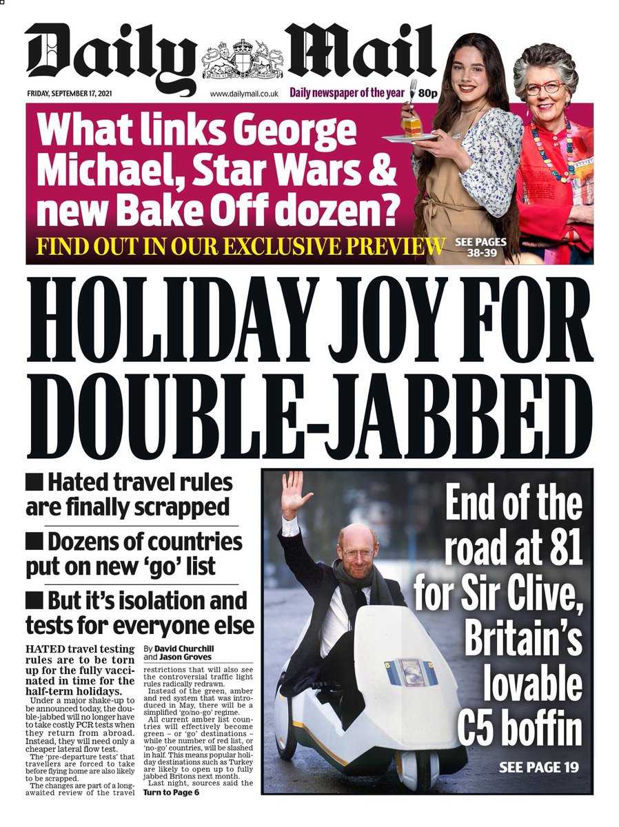 The Daily Mail says British travellers who are fully vaccinated will be able to take cheaper lateral flow tests instead of PCR tests when they return from abroad, with pre-departure tests also likely to be scrapped.