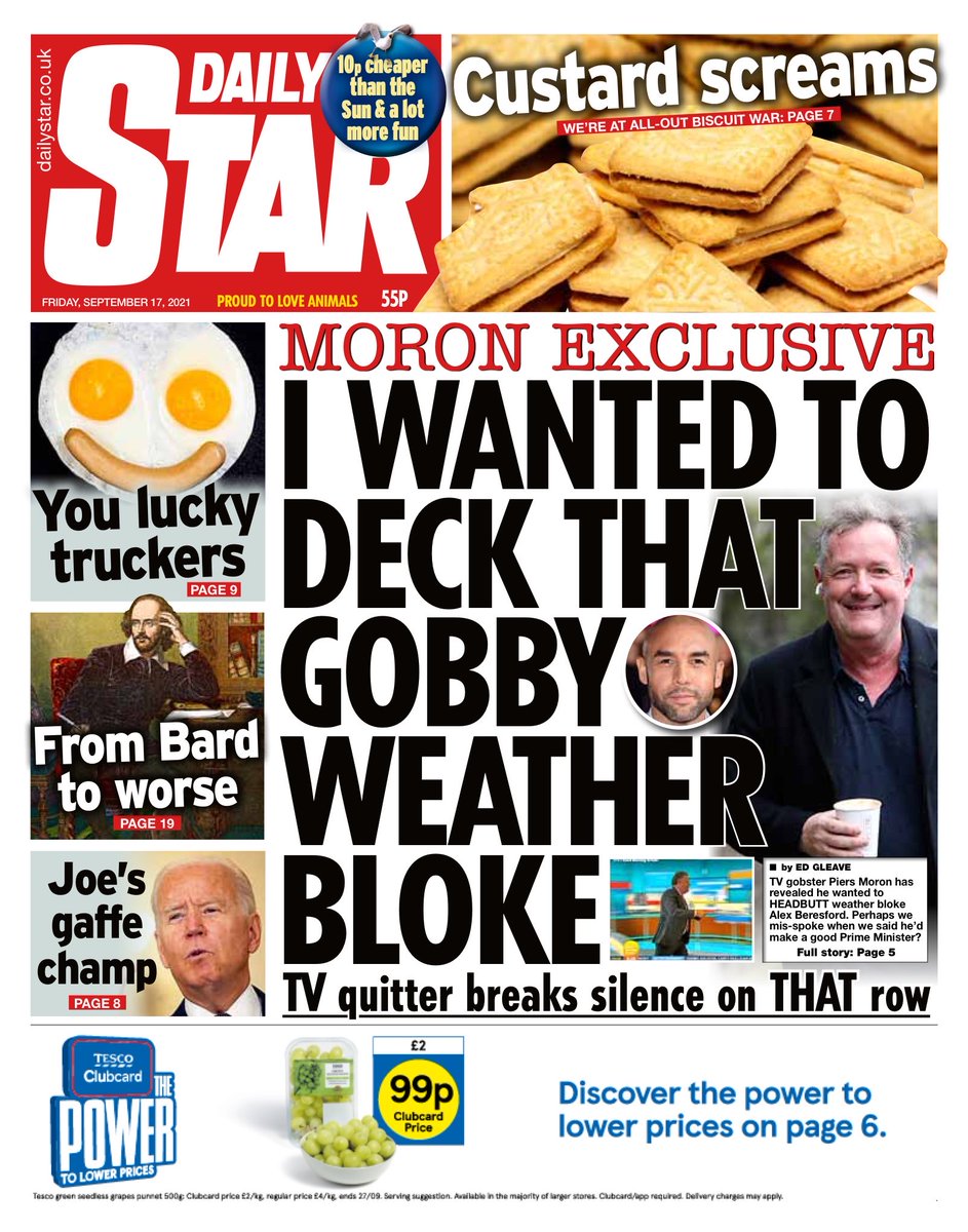 The Daily Star says it has an exclusive with “Piers Moron”, who said he wanted to headbutt weather presenter Alex Beresford.