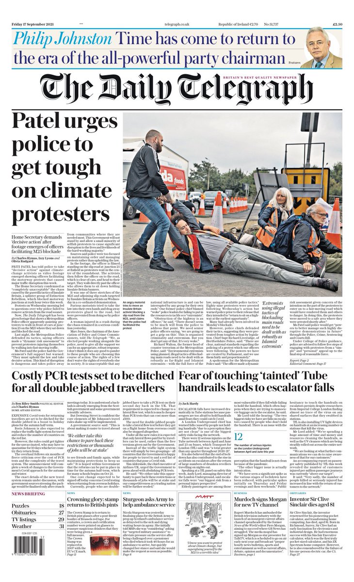 Home Secretary Priti Patel has told police to take “decisive action” against climate change activists after video showed officers facilitating a blockade of the M25, according to The Daily Telegraph.