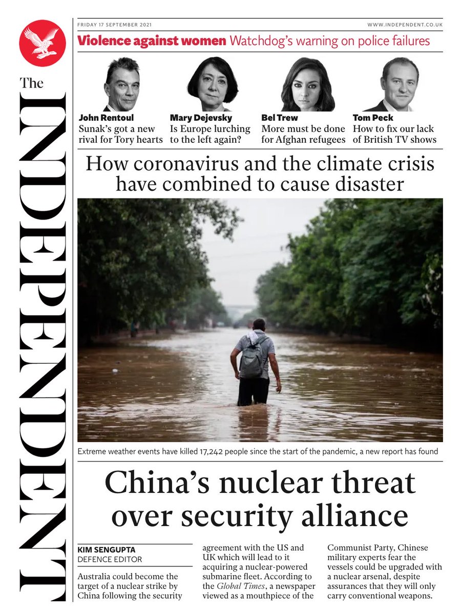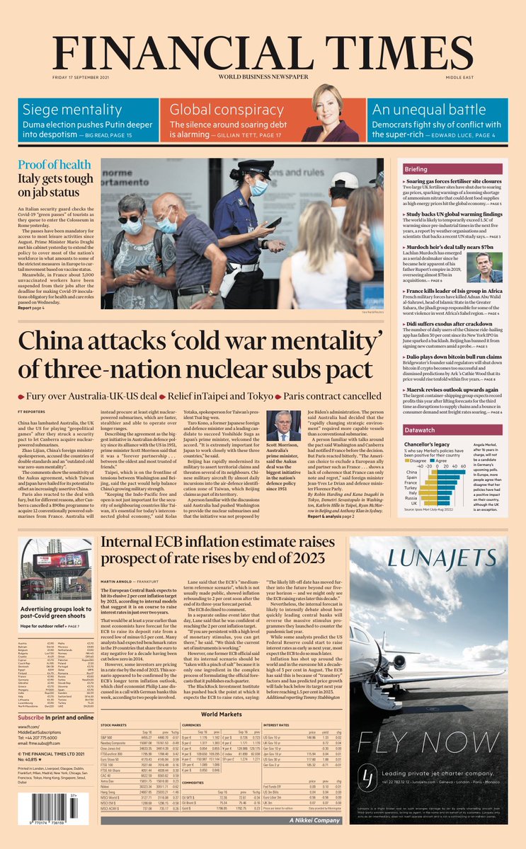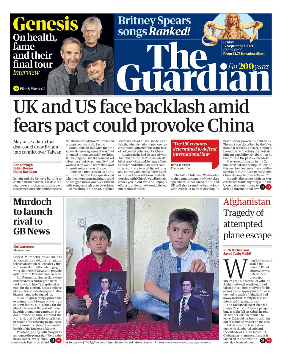 The Guardian leads with backlash over the US and UK’s nuclear submarine pact with Australia, citing concerns that the alliance could provoke China and prompt conflict in the Pacific.
