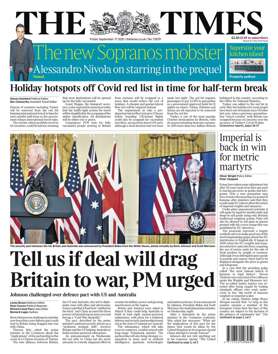 The Times reports on concerns that the UK and US’s defence pact with Australia could lead to Britain being dragged into a war with China.