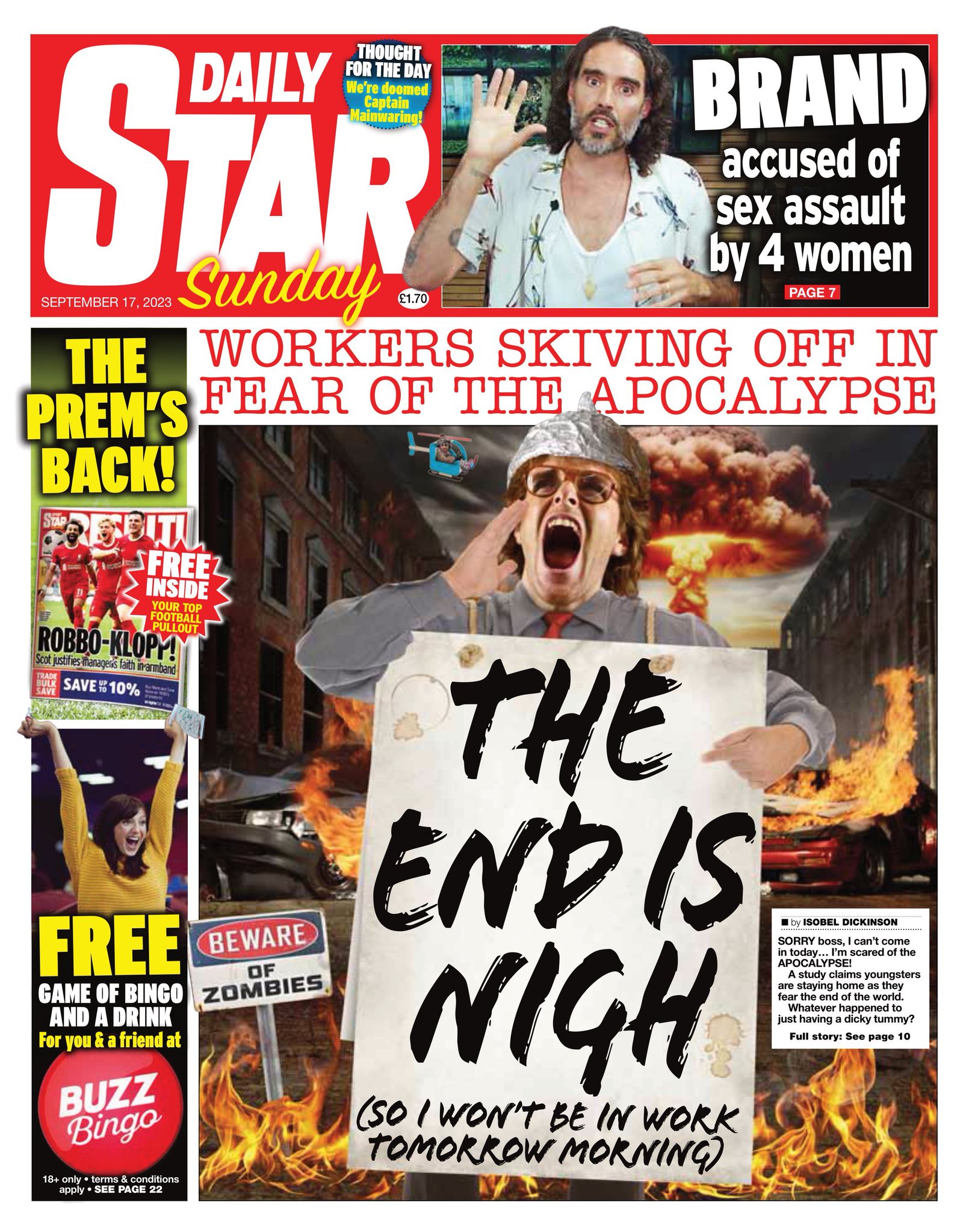 Sunday Mirror’s front page highlights the rape and sexual assault accusations levelled against comedian Russell Brand.