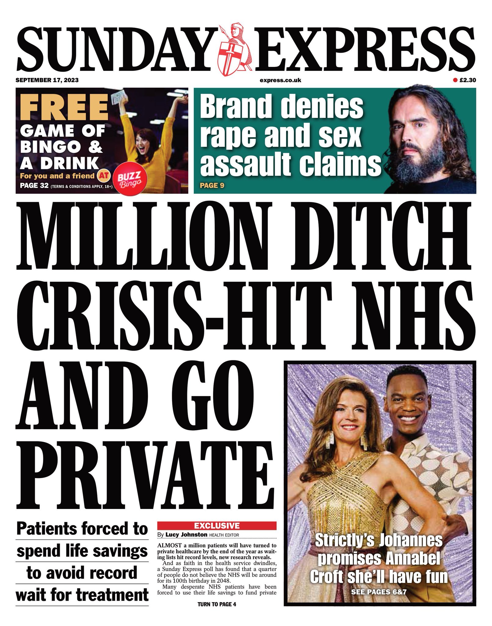 The Sunday Express reports a surge in private healthcare use as NHS waiting lists reach unprecedented levels.